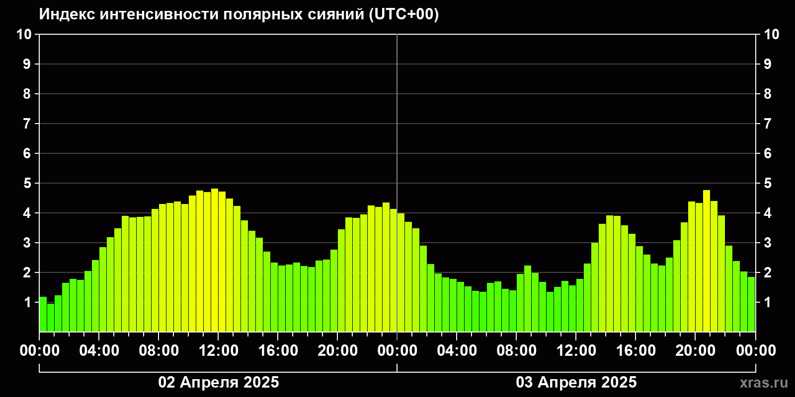 Изменения индекса интенсивности полярных сияний с 2025-04-02 по 2025-04-03 по местному времени