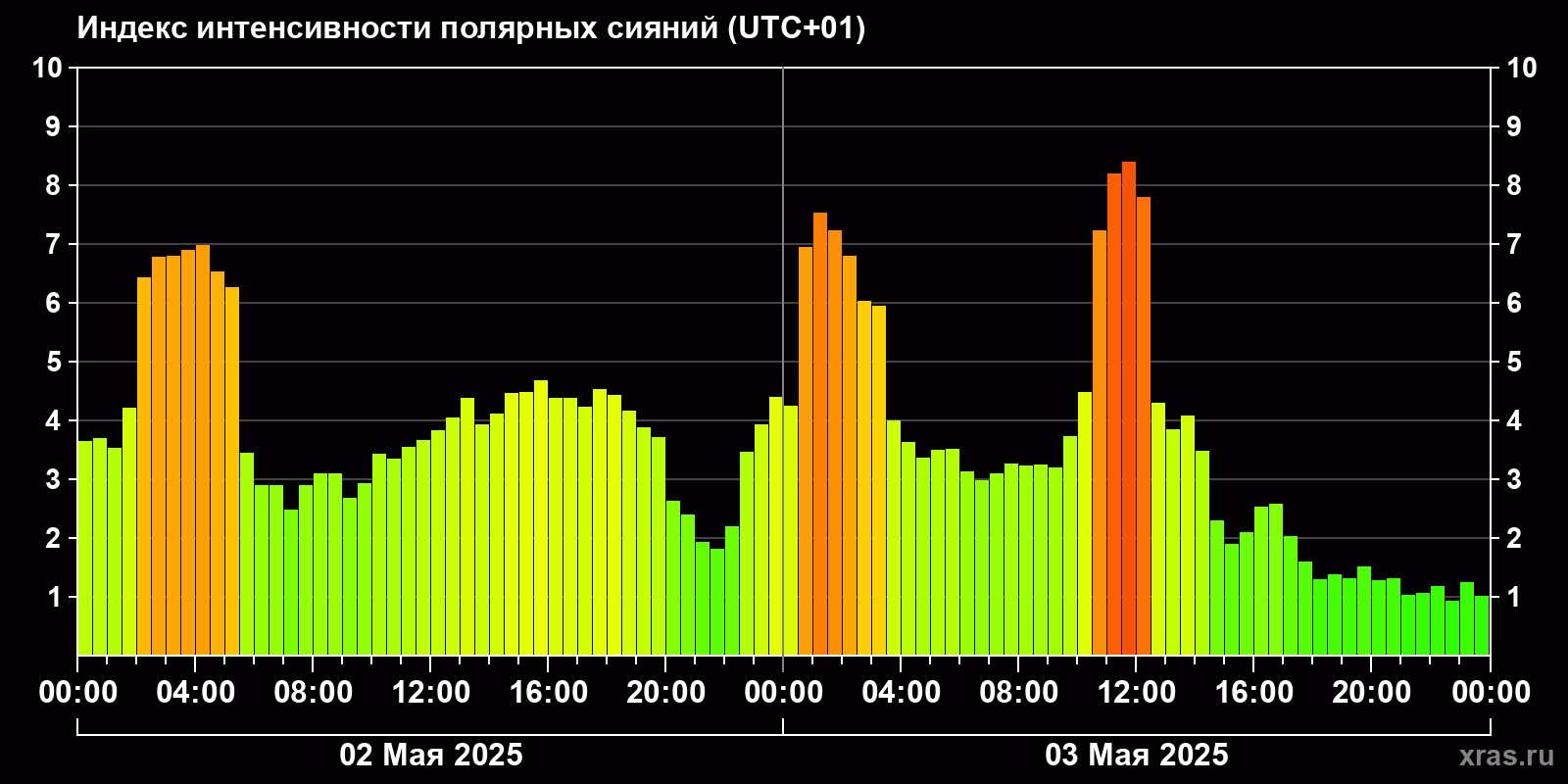 Изменения индекса интенсивности полярных сияний с 2025-05-02 по 2025-05-03 по местному времени