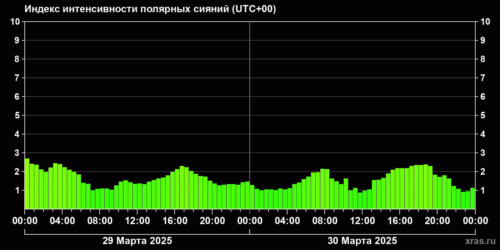 Изменения индекса интенсивности полярных сияний с 2025-03-29 по 2025-03-30 по местному времени