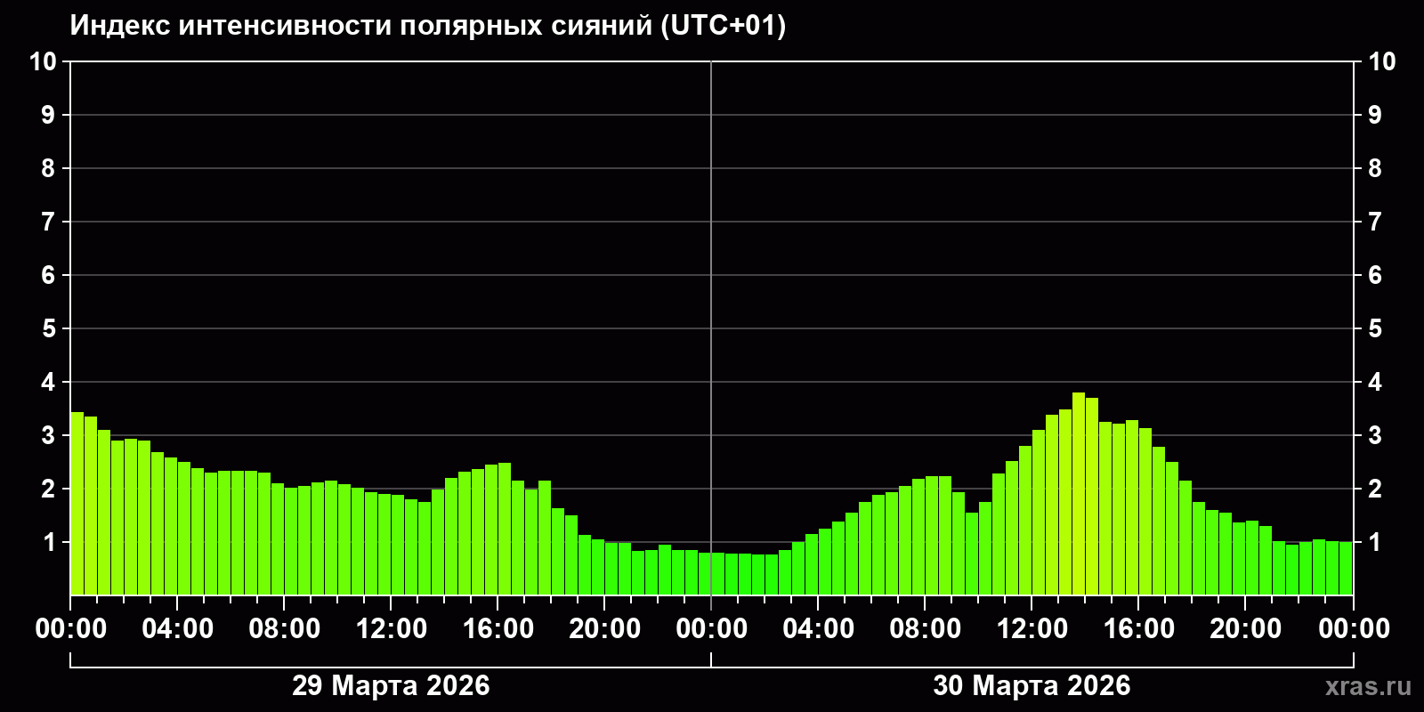 Изменения индекса интенсивности полярных сияний с 2026-03-29 по 2026-03-30 по местному времени