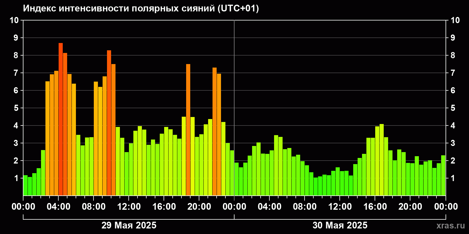 Изменения индекса интенсивности полярных сияний с 2025-05-29 по 2025-05-30 по местному времени