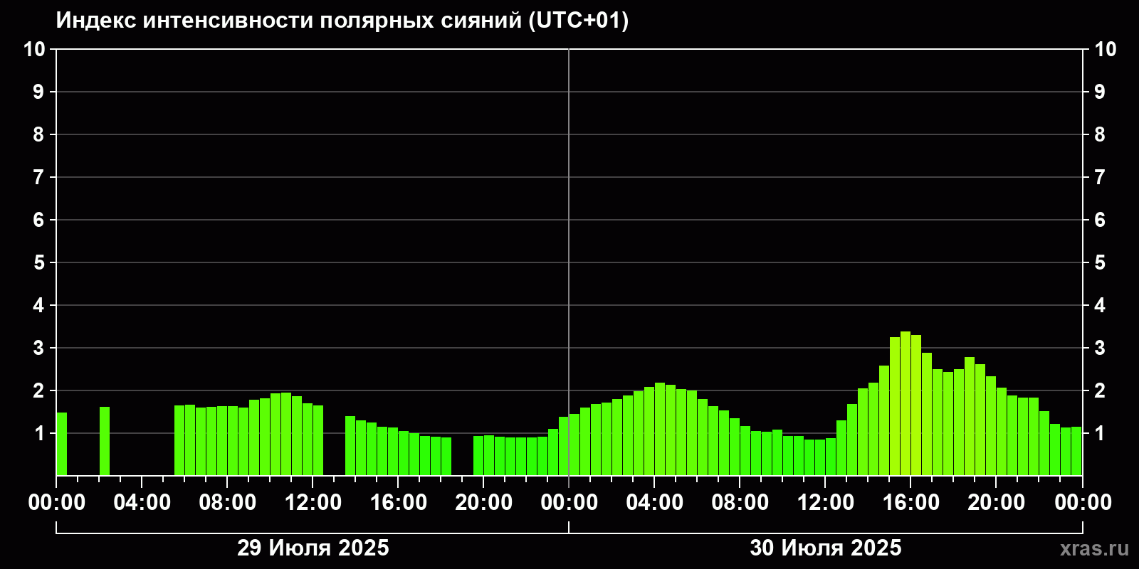 Изменения индекса интенсивности полярных сияний с 2025-07-29 по 2025-07-30 по местному времени