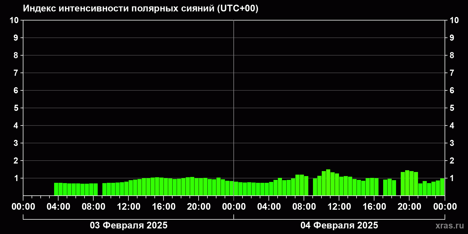 Изменения индекса интенсивности полярных сияний с 2025-02-03 по 2025-02-04 по местному времени