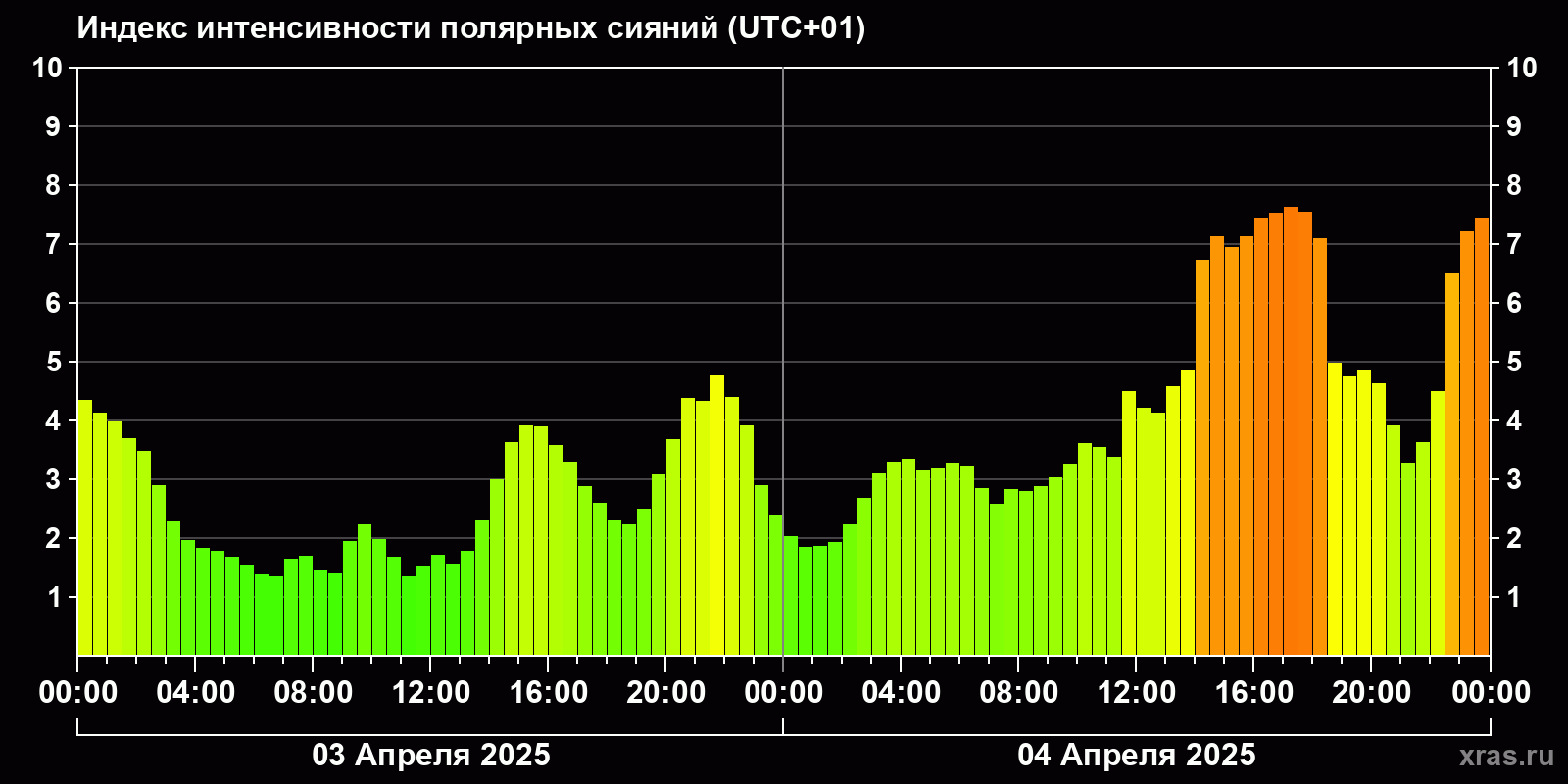Изменения индекса интенсивности полярных сияний с 2025-04-03 по 2025-04-04 по местному времени