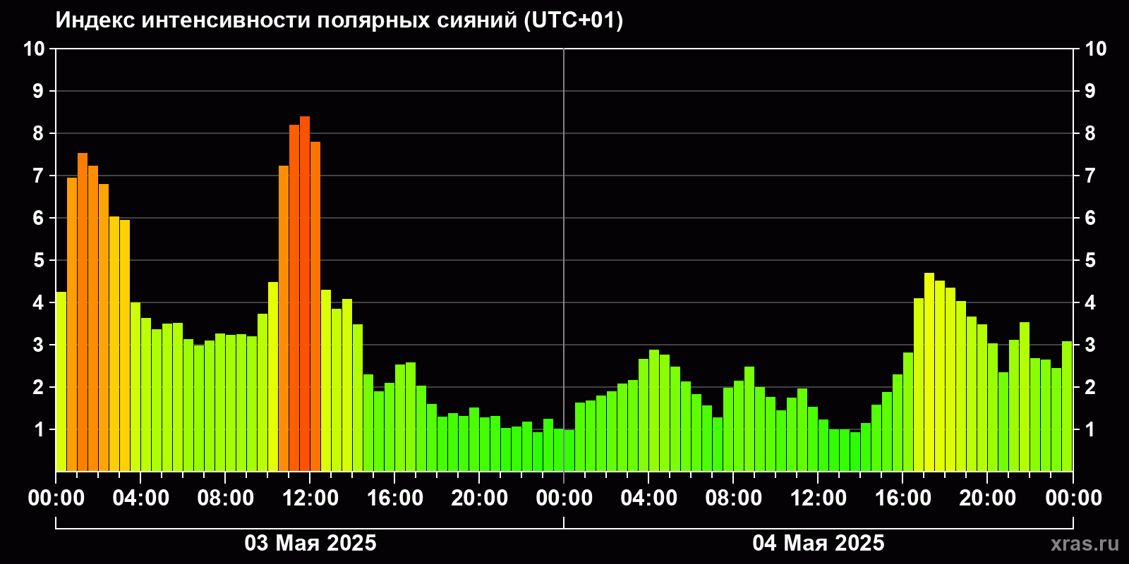 Изменения индекса интенсивности полярных сияний с 2025-05-03 по 2025-05-04 по местному времени