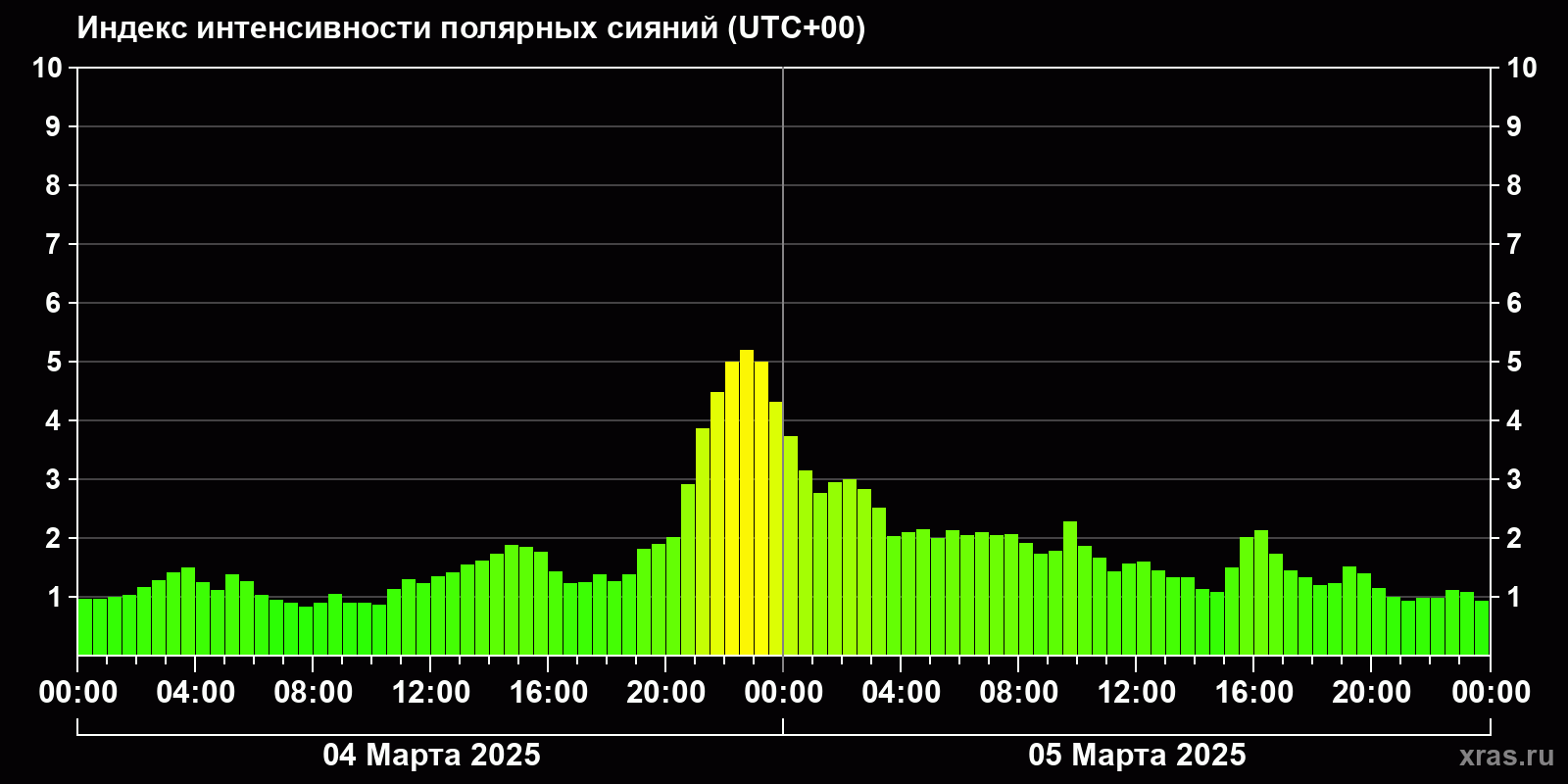 Изменения индекса интенсивности полярных сияний с 2025-03-04 по 2025-03-05 по местному времени