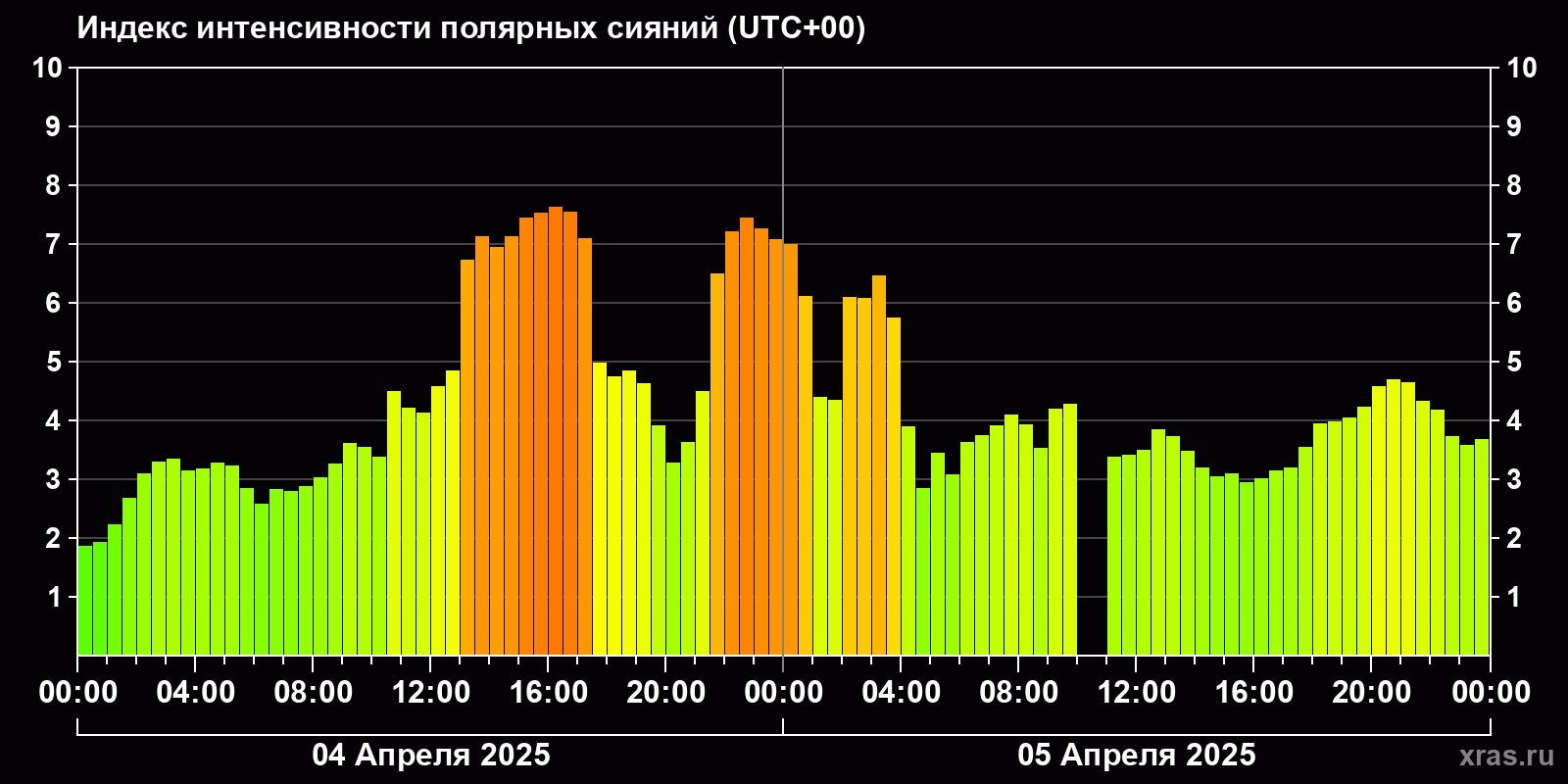 Изменения индекса интенсивности полярных сияний с 2025-04-04 по 2025-04-05 по местному времени