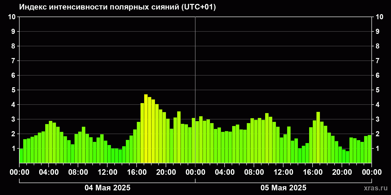 Изменения индекса интенсивности полярных сияний с 2025-05-04 по 2025-05-05 по местному времени