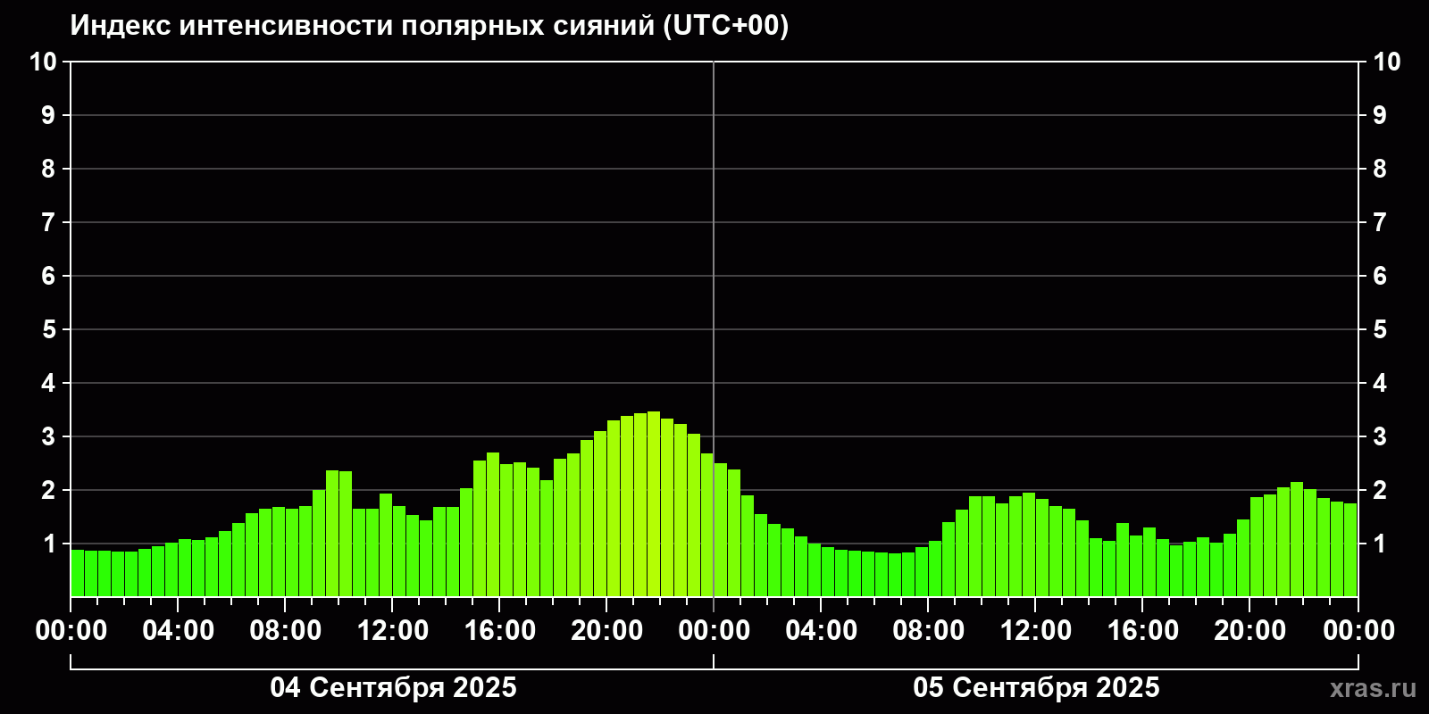 Изменения индекса интенсивности полярных сияний с 2025-09-04 по 2025-09-05 по местному времени