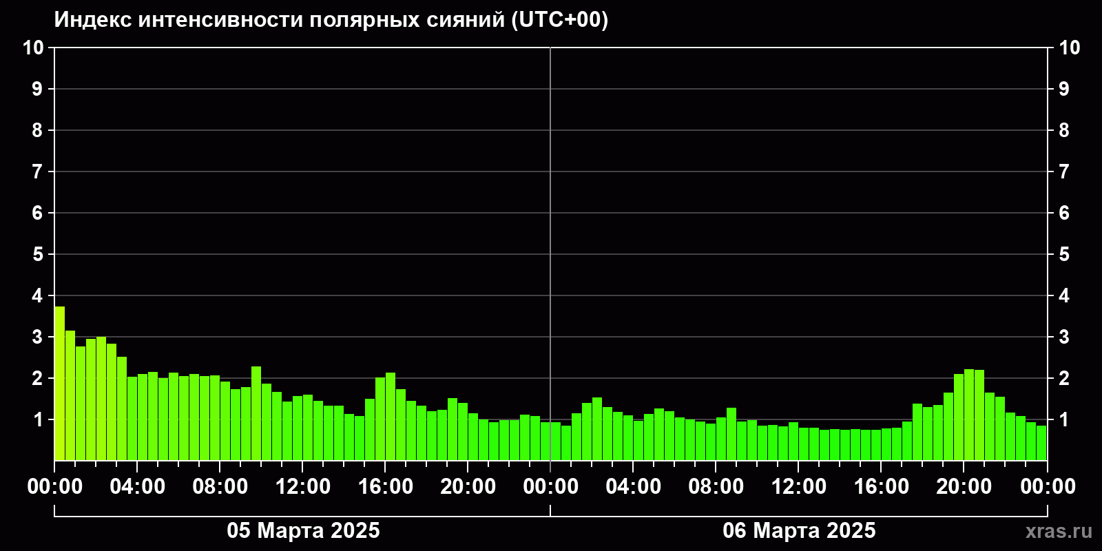 Изменения индекса интенсивности полярных сияний с 2025-03-05 по 2025-03-06 по местному времени
