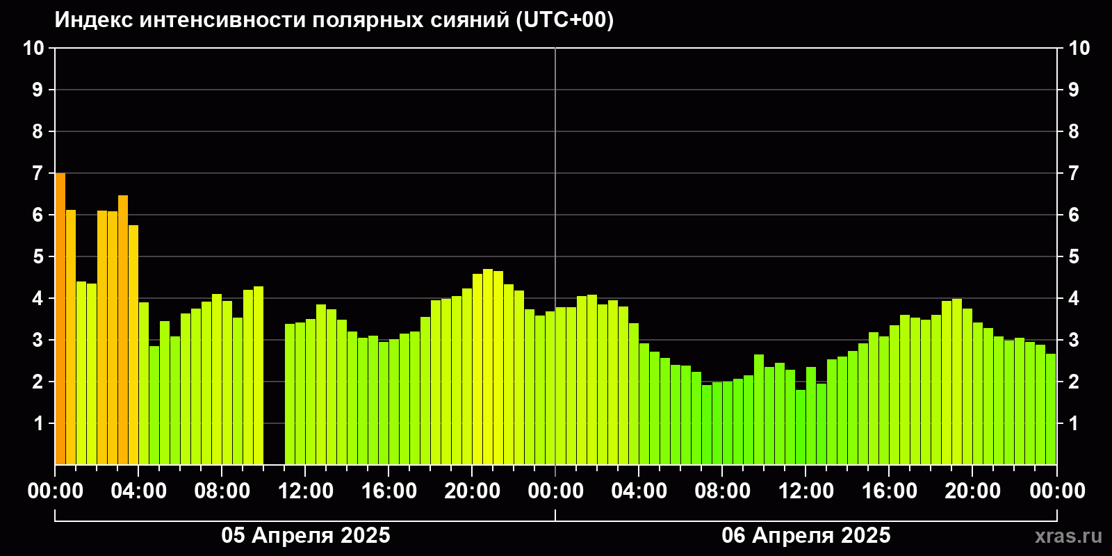 Изменения индекса интенсивности полярных сияний с 2025-04-05 по 2025-04-06 по местному времени