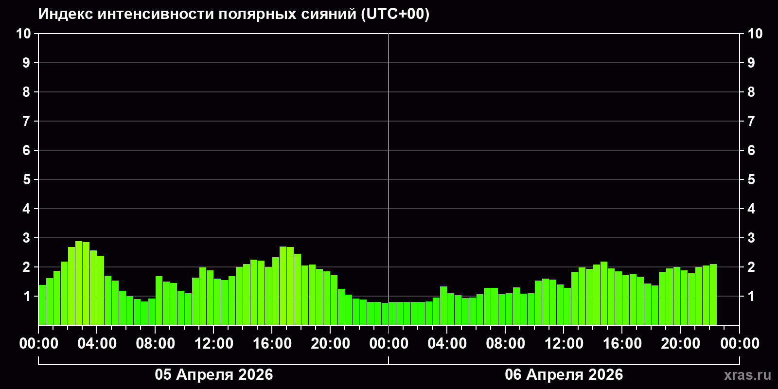 Изменения индекса интенсивности полярных сияний с 2026-04-05 по 2026-04-06 по местному времени