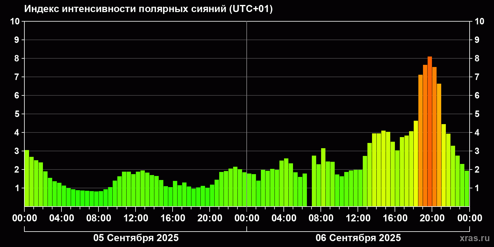 Изменения индекса интенсивности полярных сияний с 2025-09-05 по 2025-09-06 по местному времени