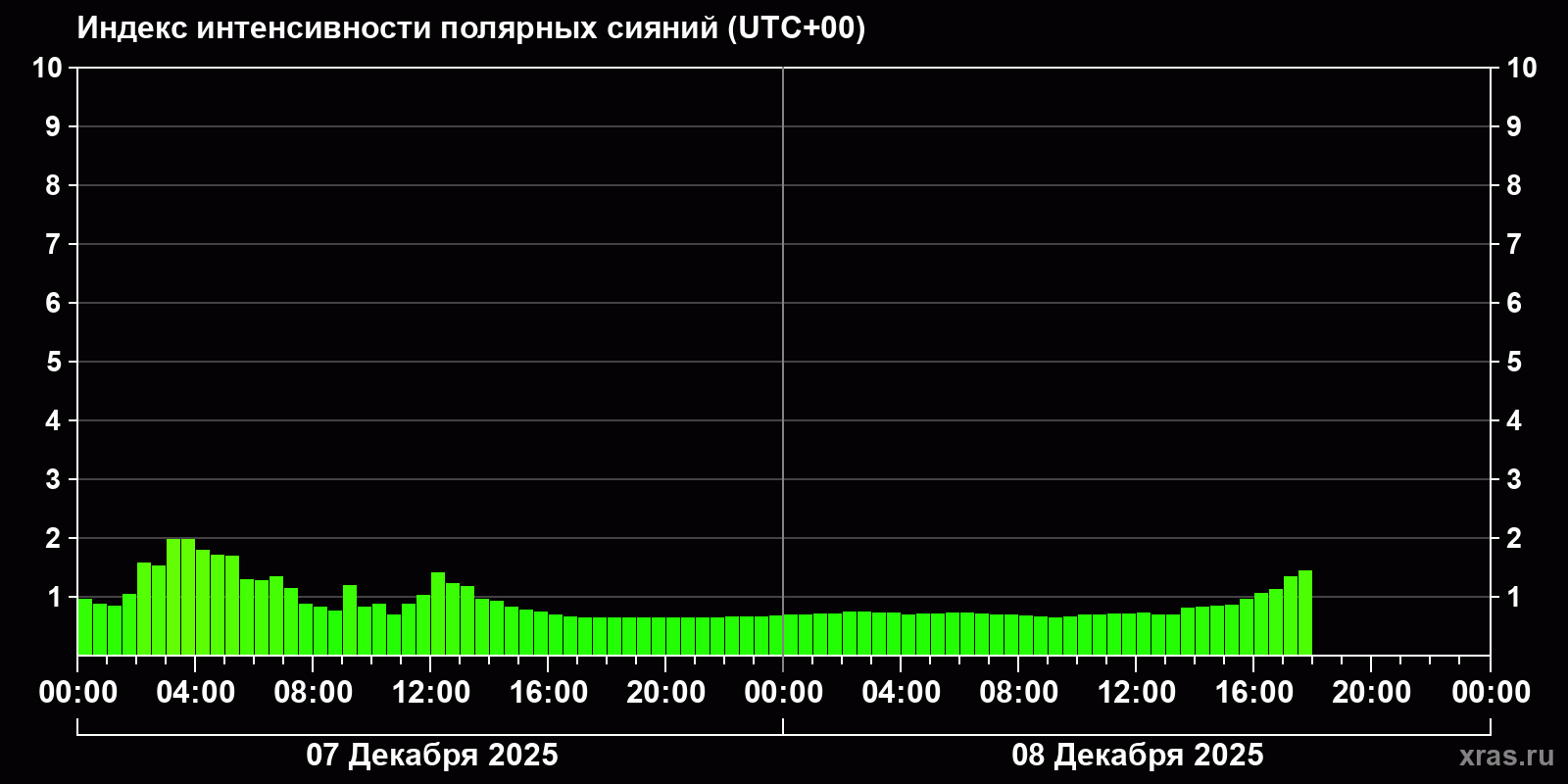 Изменения индекса интенсивности полярных сияний с 2025-12-07 по 2025-12-08 по местному времени
