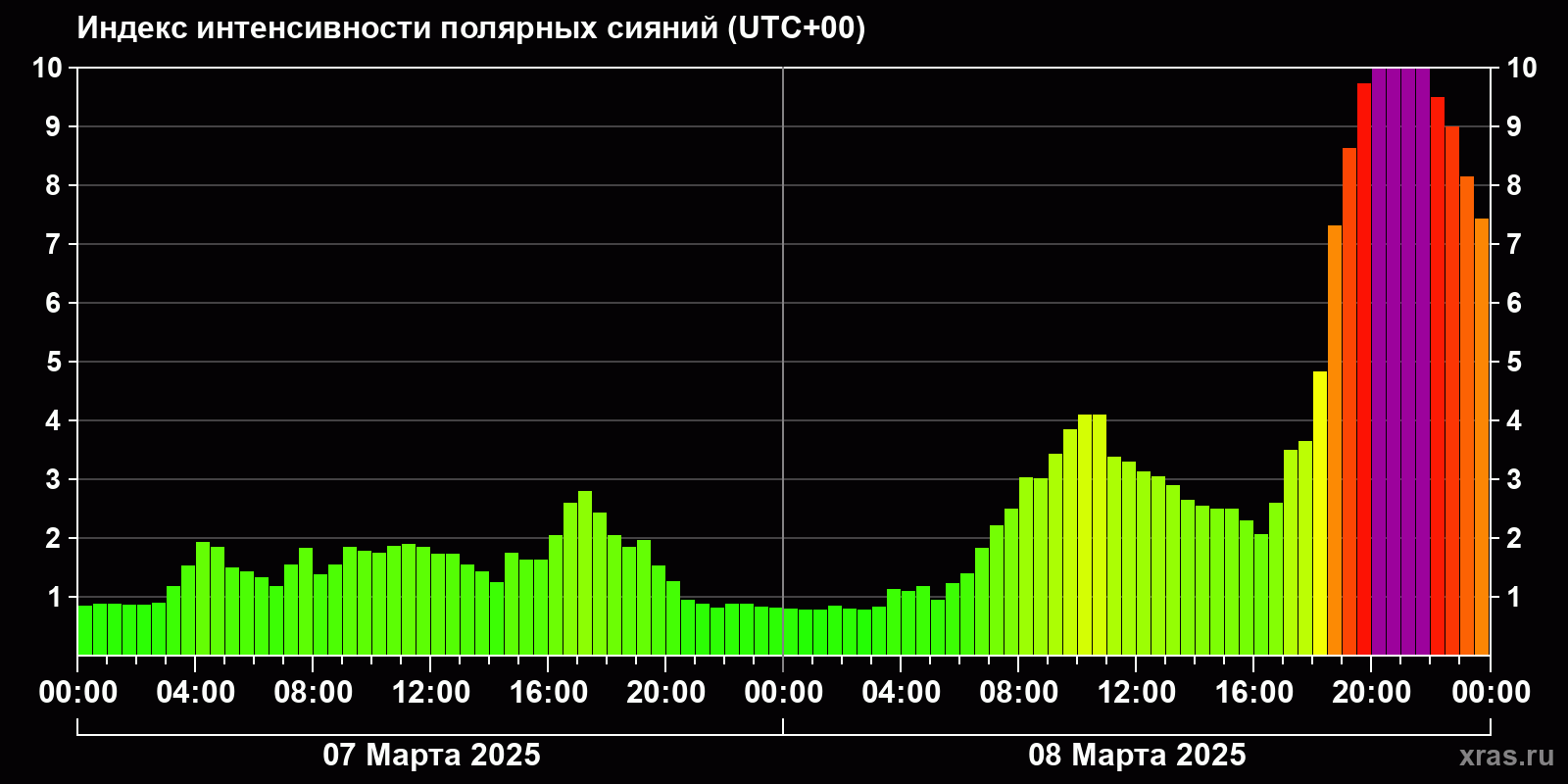Изменения индекса интенсивности полярных сияний с 2025-03-07 по 2025-03-08 по местному времени
