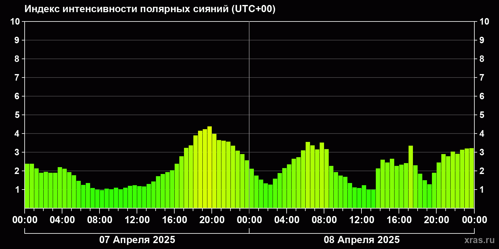 Изменения индекса интенсивности полярных сияний с 2025-04-07 по 2025-04-08 по местному времени