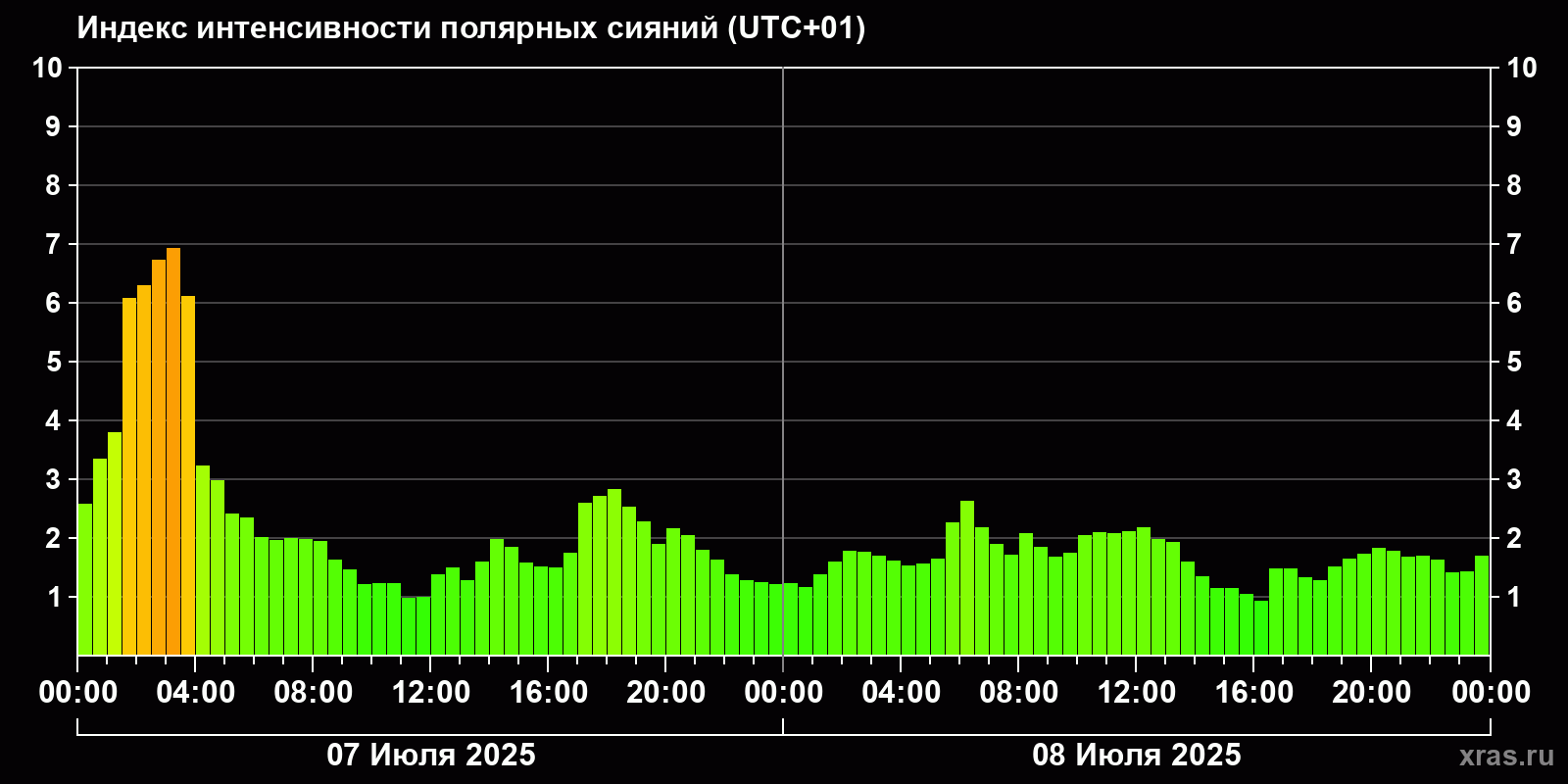 Изменения индекса интенсивности полярных сияний с 2025-07-07 по 2025-07-08 по местному времени
