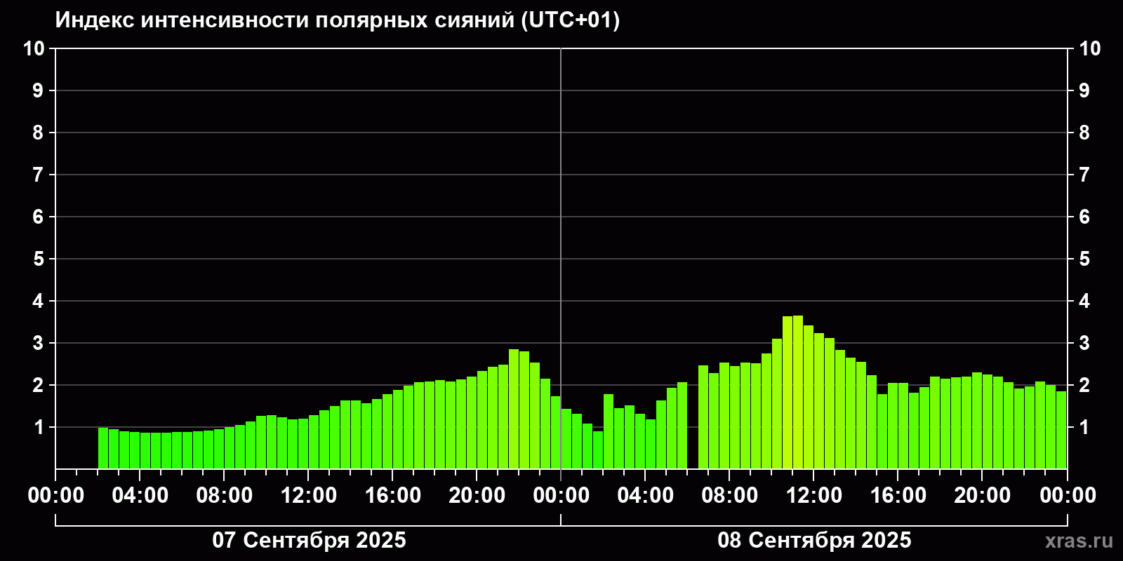 Изменения индекса интенсивности полярных сияний с 2025-09-07 по 2025-09-08 по местному времени
