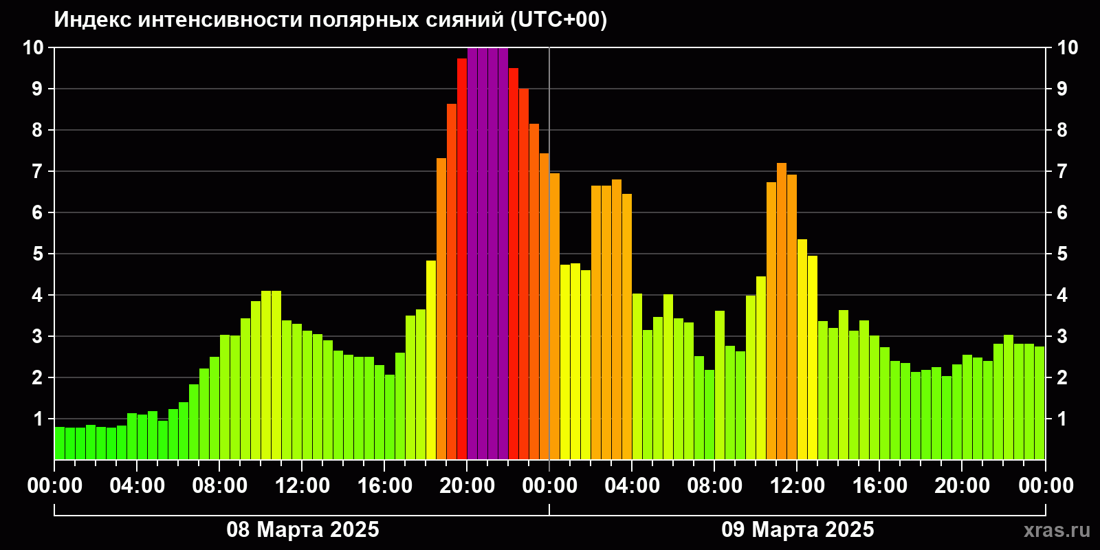 Изменения индекса интенсивности полярных сияний с 2025-03-08 по 2025-03-09 по местному времени