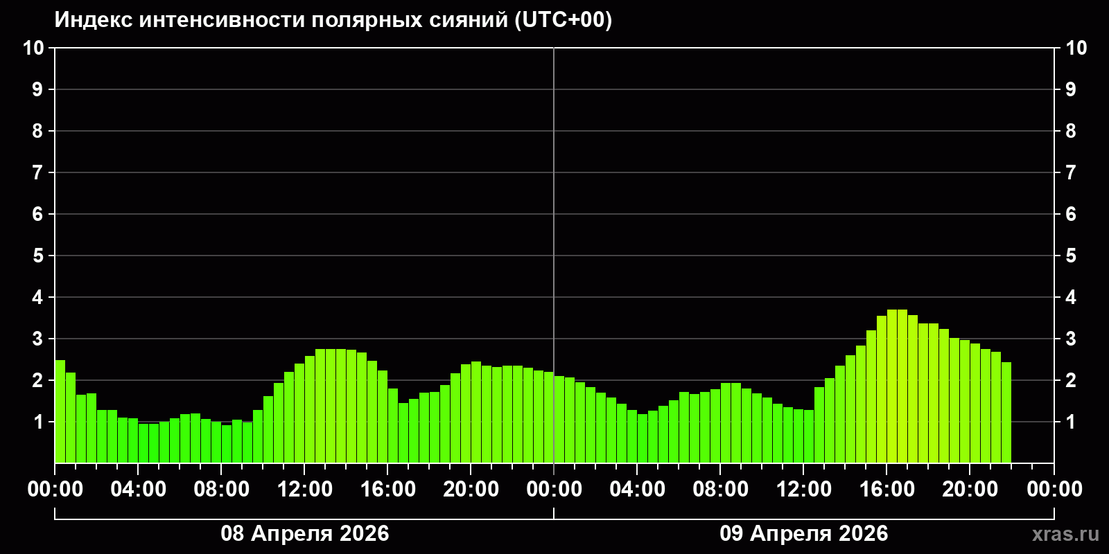 Изменения индекса интенсивности полярных сияний с 2026-04-08 по 2026-04-09 по местному времени