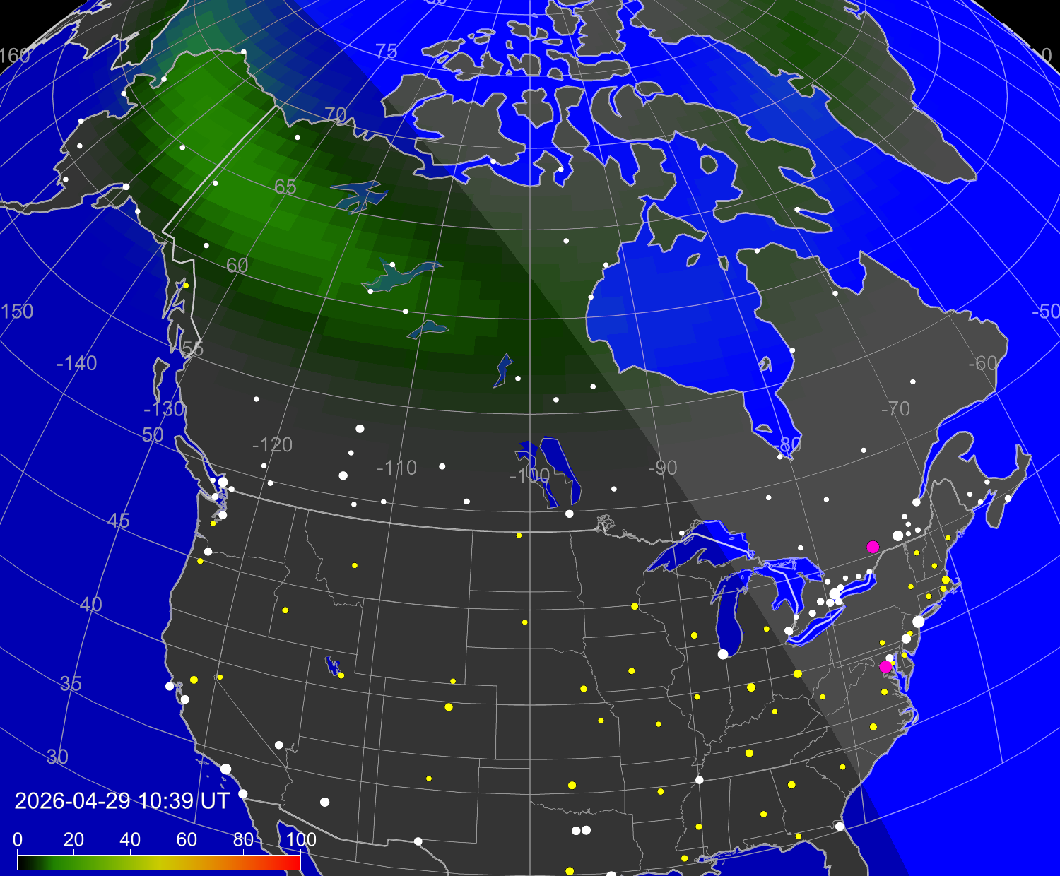 Индекс интенсивности полярных сияний и теоретически возможная широта наблюдений для ночного времени в западном полушарии