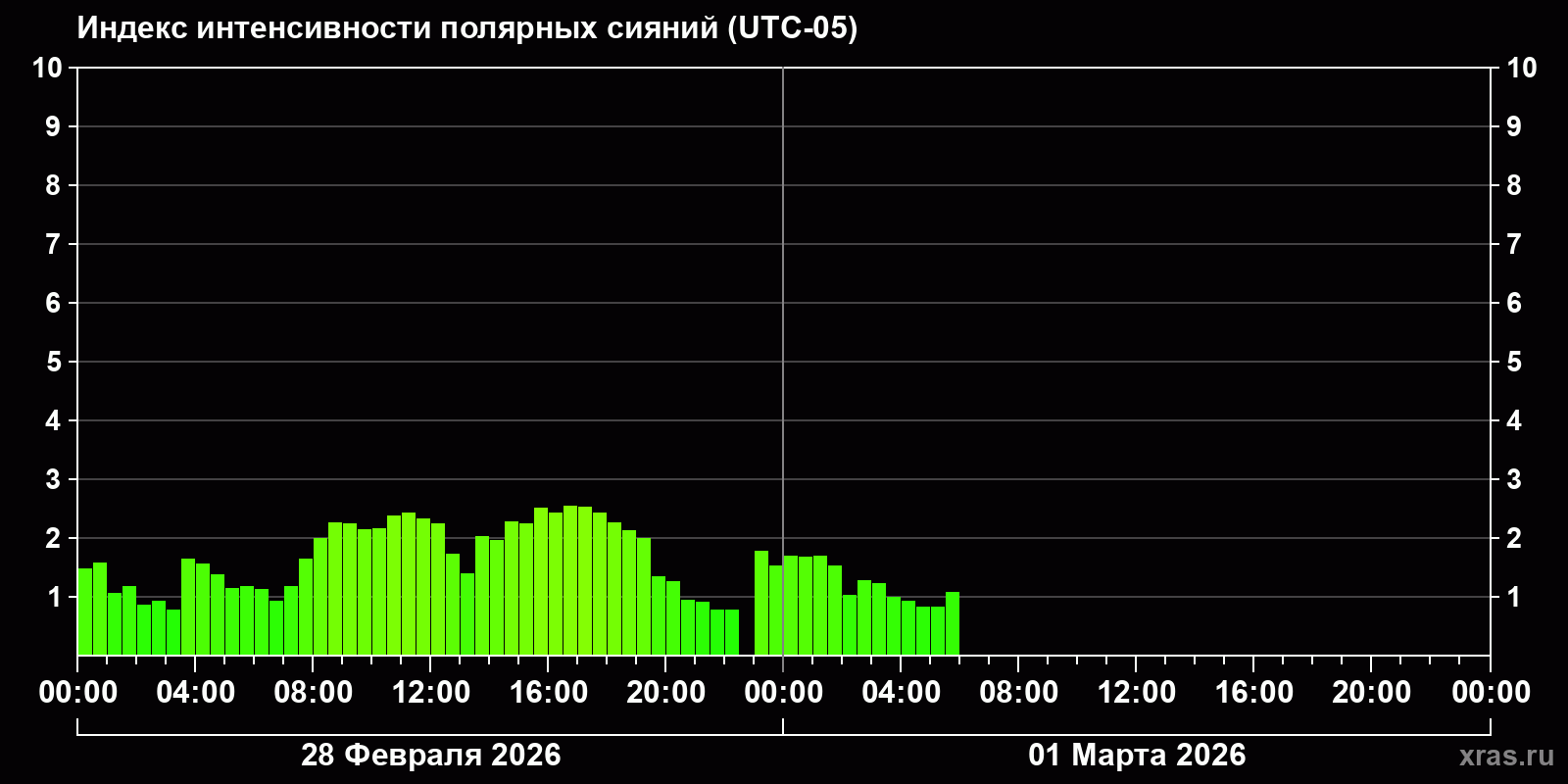 Изменения индекса интенсивности полярных сияний с 2026-02-28 по 2026-03-01 по местному времени