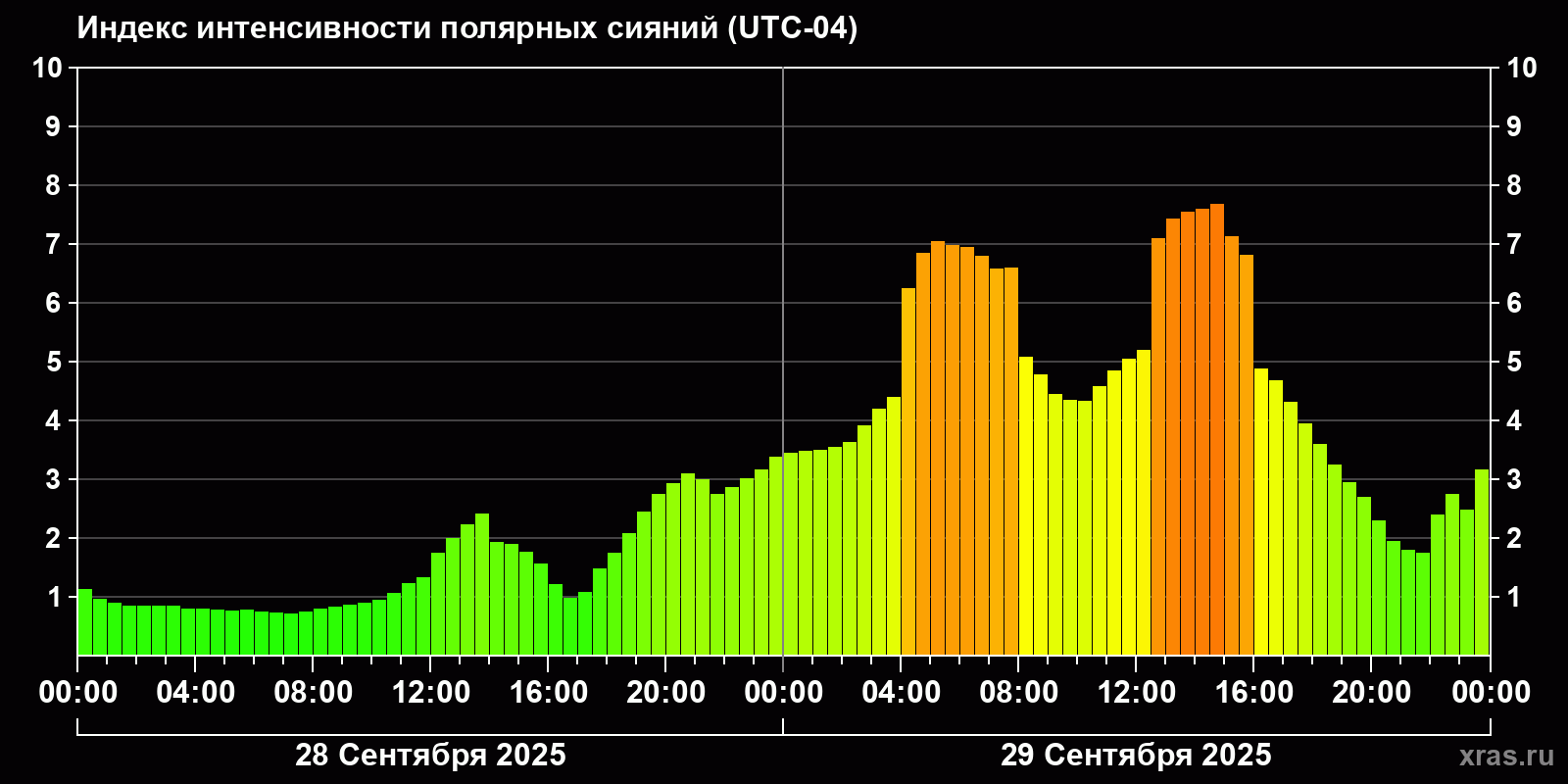 Изменения индекса интенсивности полярных сияний с 2025-09-28 по 2025-09-29 по местному времени