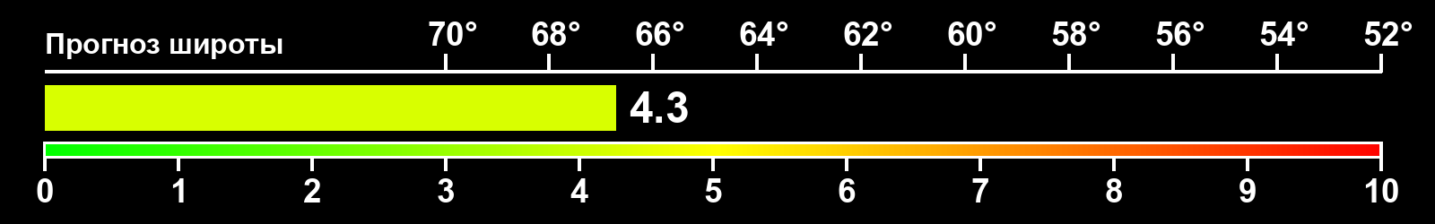 Индекс интенсивности полярных сияний и теоретически возможная широта наблюдений для ночного времени в восточном полушарии по состоянию на 2026-02-13 23:48 (конец дня) по местному времени