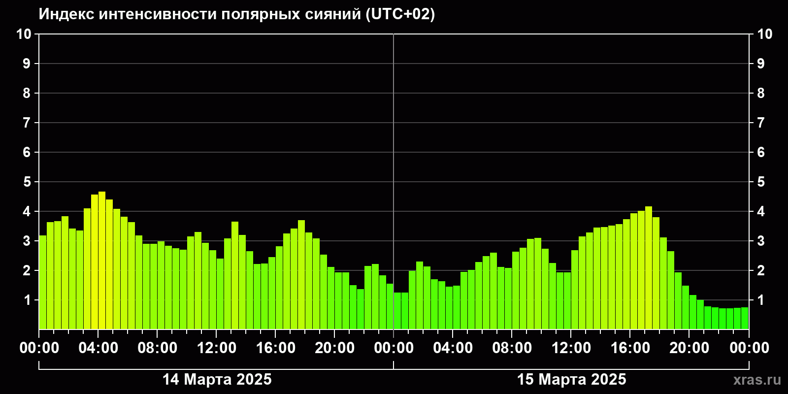Изменения индекса интенсивности полярных сияний с 2025-03-14 по 2025-03-15 по местному времени