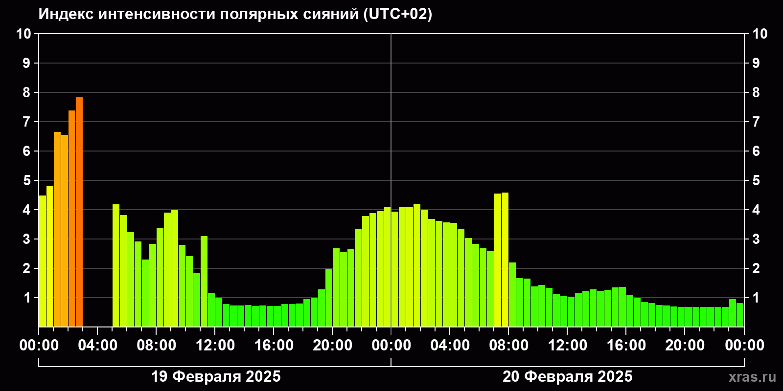 Изменения индекса интенсивности полярных сияний с 2025-02-19 по 2025-02-20 по местному времени