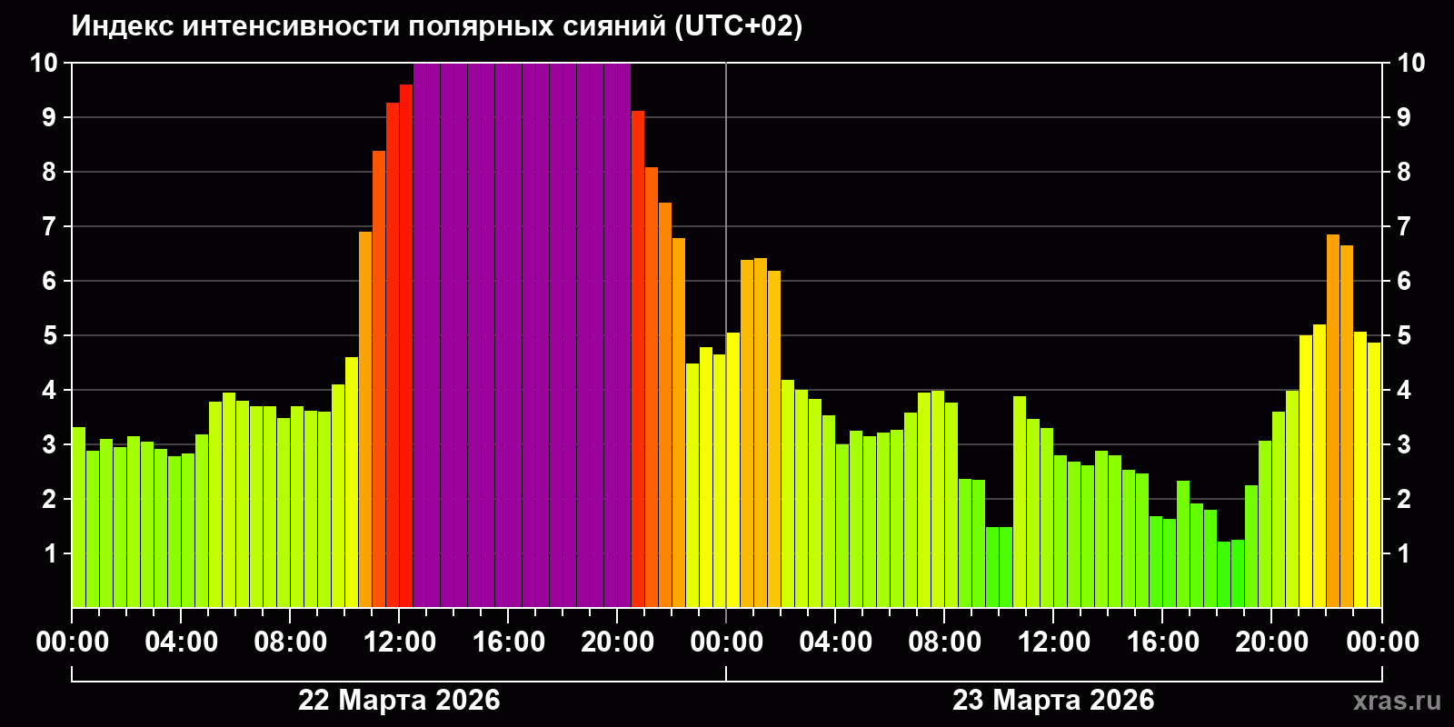 Изменения индекса интенсивности полярных сияний с 2026-03-22 по 2026-03-23 по местному времени