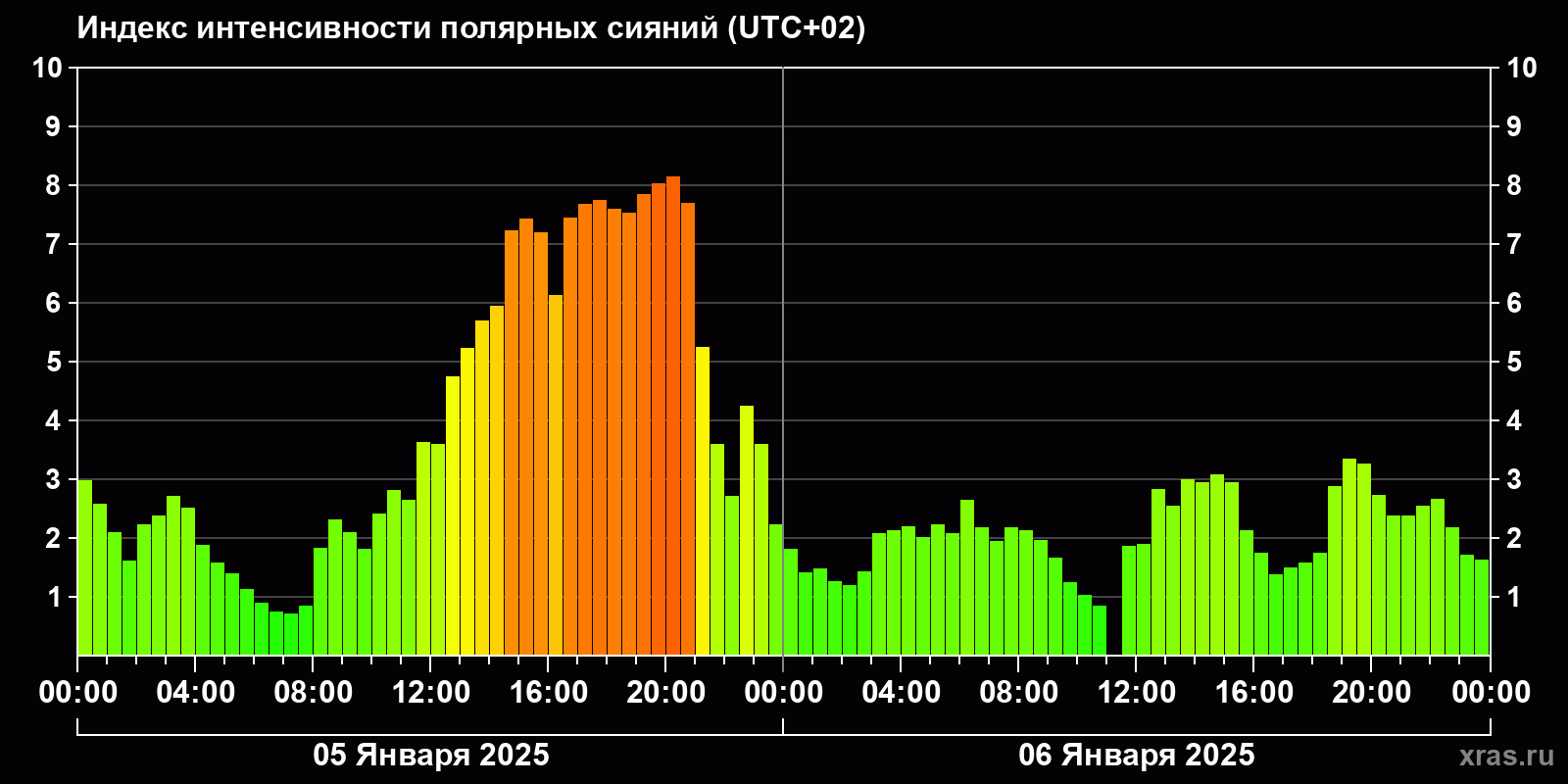 Изменения индекса интенсивности полярных сияний с 2025-01-05 по 2025-01-06 по местному времени