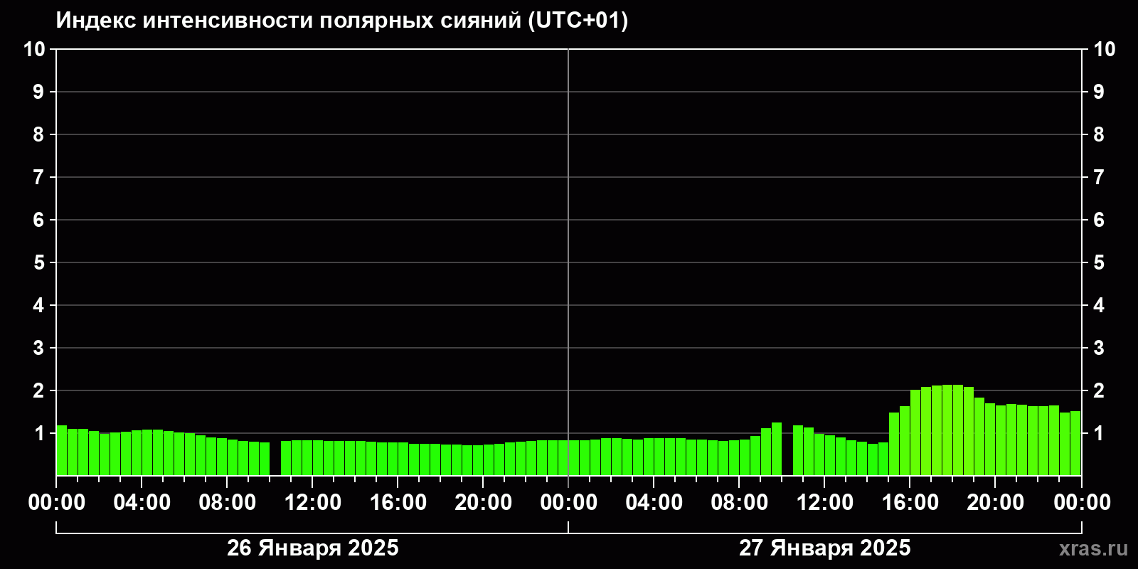 Изменения индекса интенсивности полярных сияний с 2025-01-26 по 2025-01-27 по местному времени