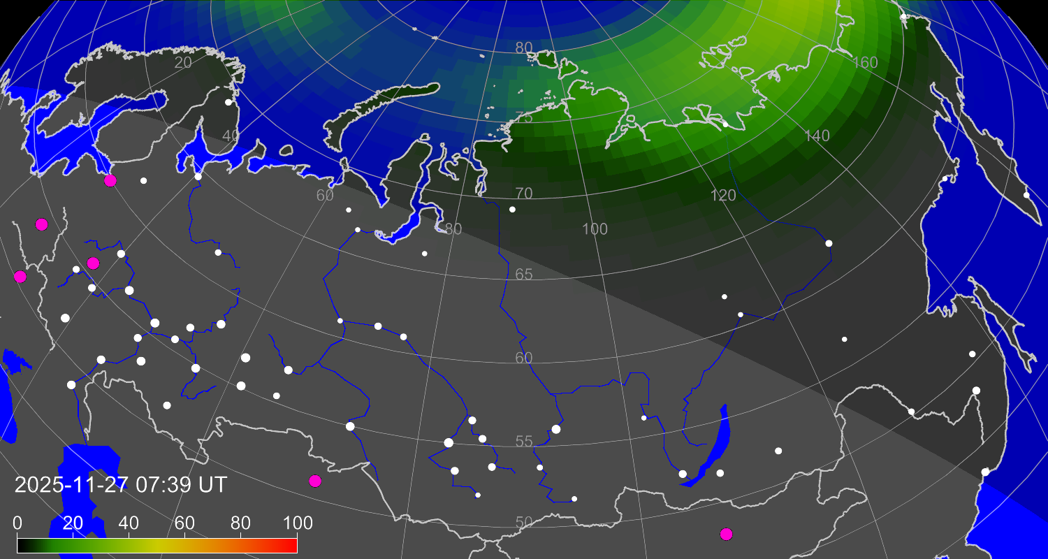 Изменения и часовой прогноз индекса интенсивности полярных сияний с 2025-11-26 по 2025-11-27