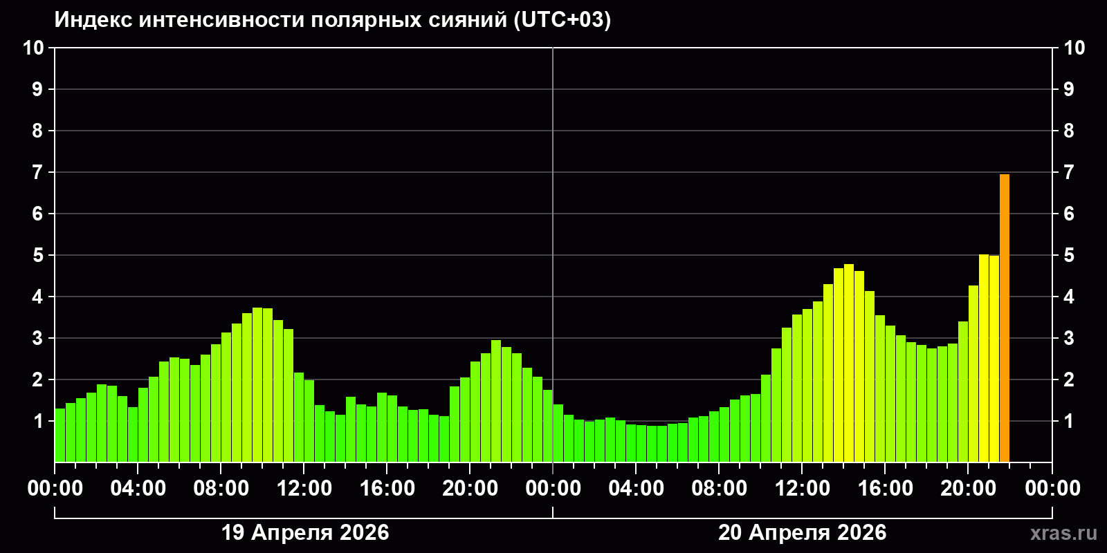 Изменения индекса интенсивности полярных сияний с 2026-04-19 по 2026-04-20 по местному времени