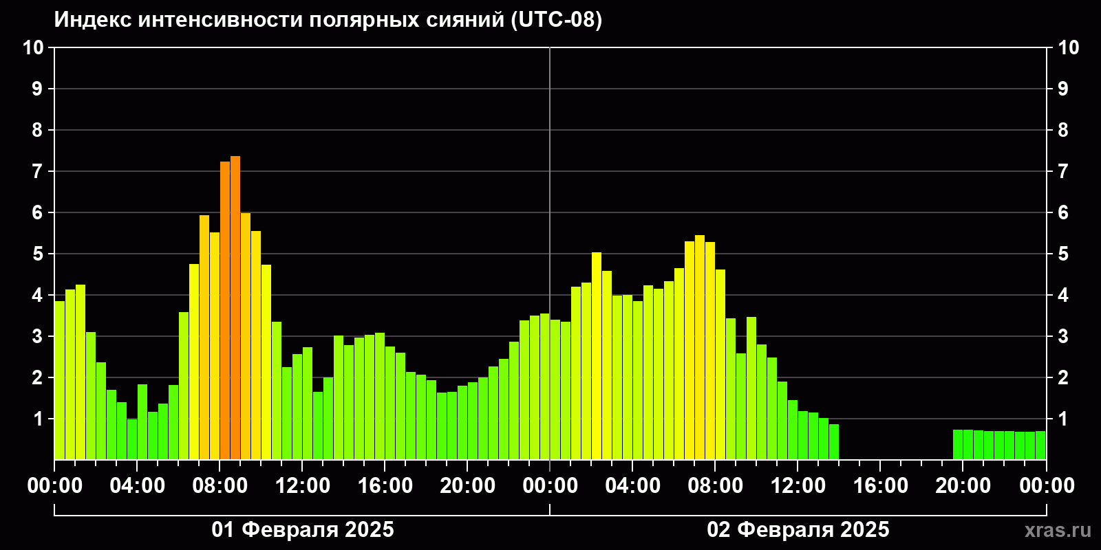 Изменения индекса интенсивности полярных сияний с 2025-02-01 по 2025-02-02 по местному времени