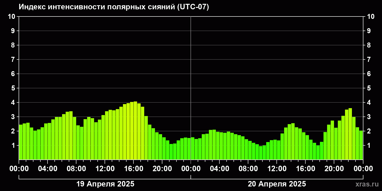 Изменения индекса интенсивности полярных сияний с 2025-04-19 по 2025-04-20 по местному времени