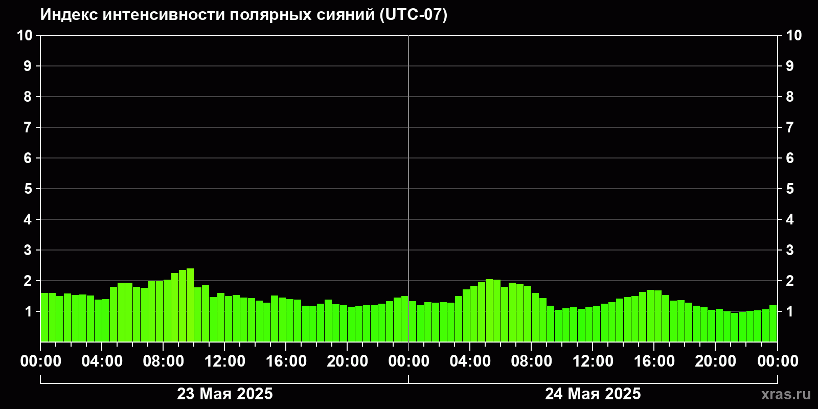 Изменения индекса интенсивности полярных сияний с 2025-05-23 по 2025-05-24 по местному времени