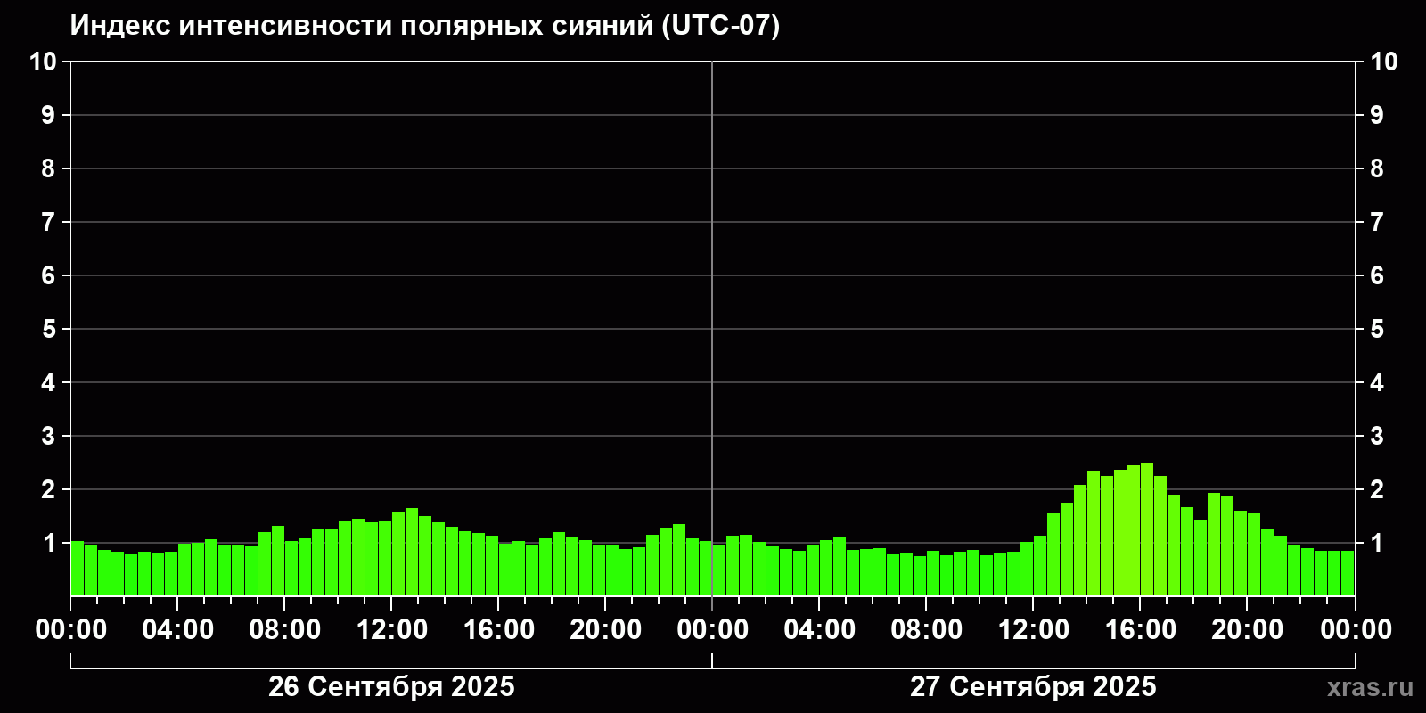 Изменения индекса интенсивности полярных сияний с 2025-09-26 по 2025-09-27 по местному времени