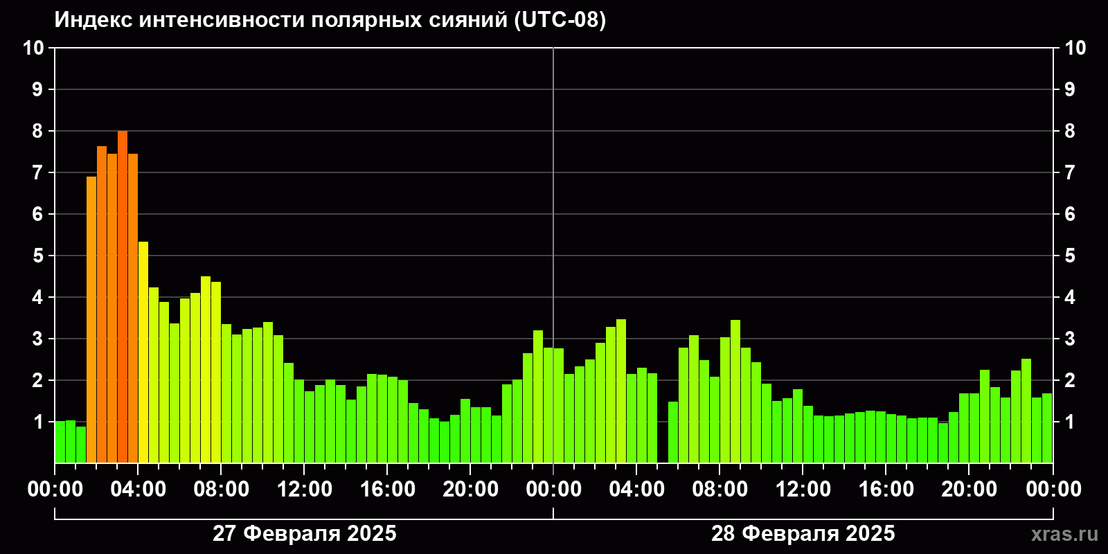 Изменения индекса интенсивности полярных сияний с 2025-02-27 по 2025-02-28 по местному времени