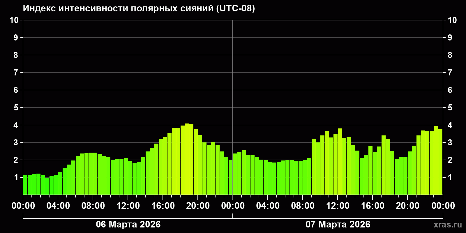Изменения индекса интенсивности полярных сияний с 2026-03-06 по 2026-03-07 по местному времени
