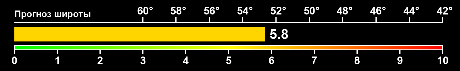 Индекс интенсивности полярных сияний и теоретически возможная широта наблюдений для ночного времени в западном полушарии по состоянию на 2025-12-11 23:52 (конец дня) по местному времени