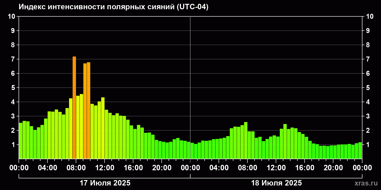 Изменения индекса интенсивности полярных сияний с 2025-07-17 по 2025-07-18 по местному времени