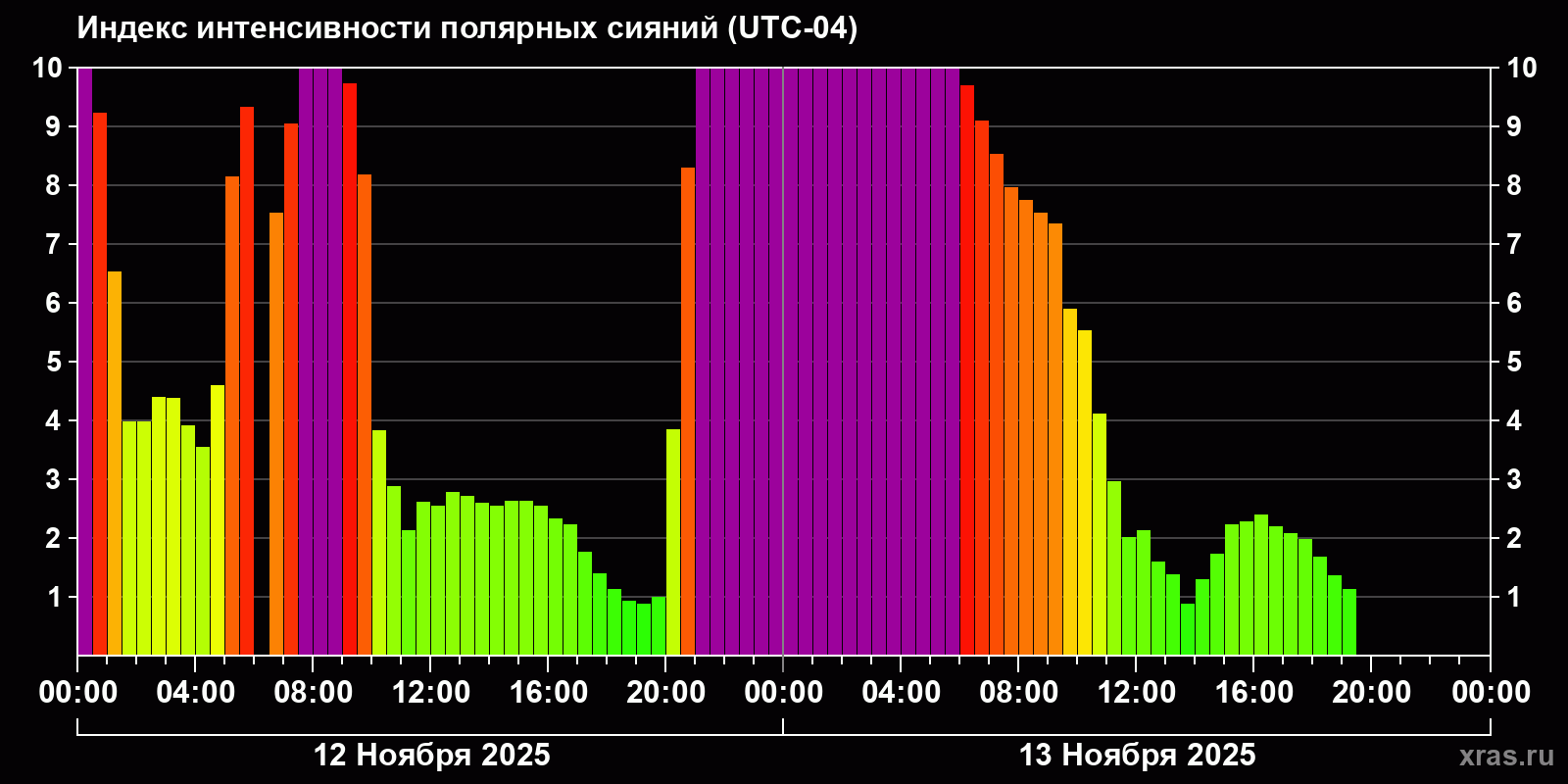 Изменения индекса интенсивности полярных сияний с 2025-11-12 по 2025-11-13 по местному времени