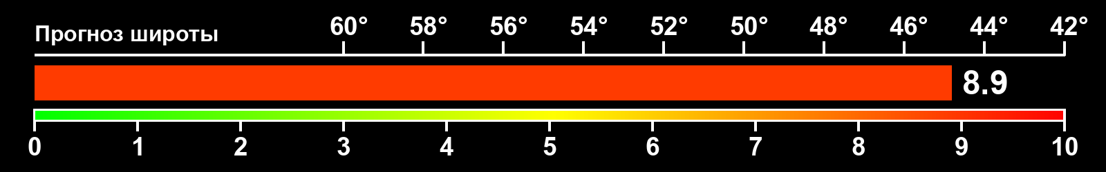 Индекс интенсивности полярных сияний и теоретически возможная широта наблюдений для ночного времени в западном полушарии по состоянию на 2026-03-13 23:57 (конец дня) по местному времени