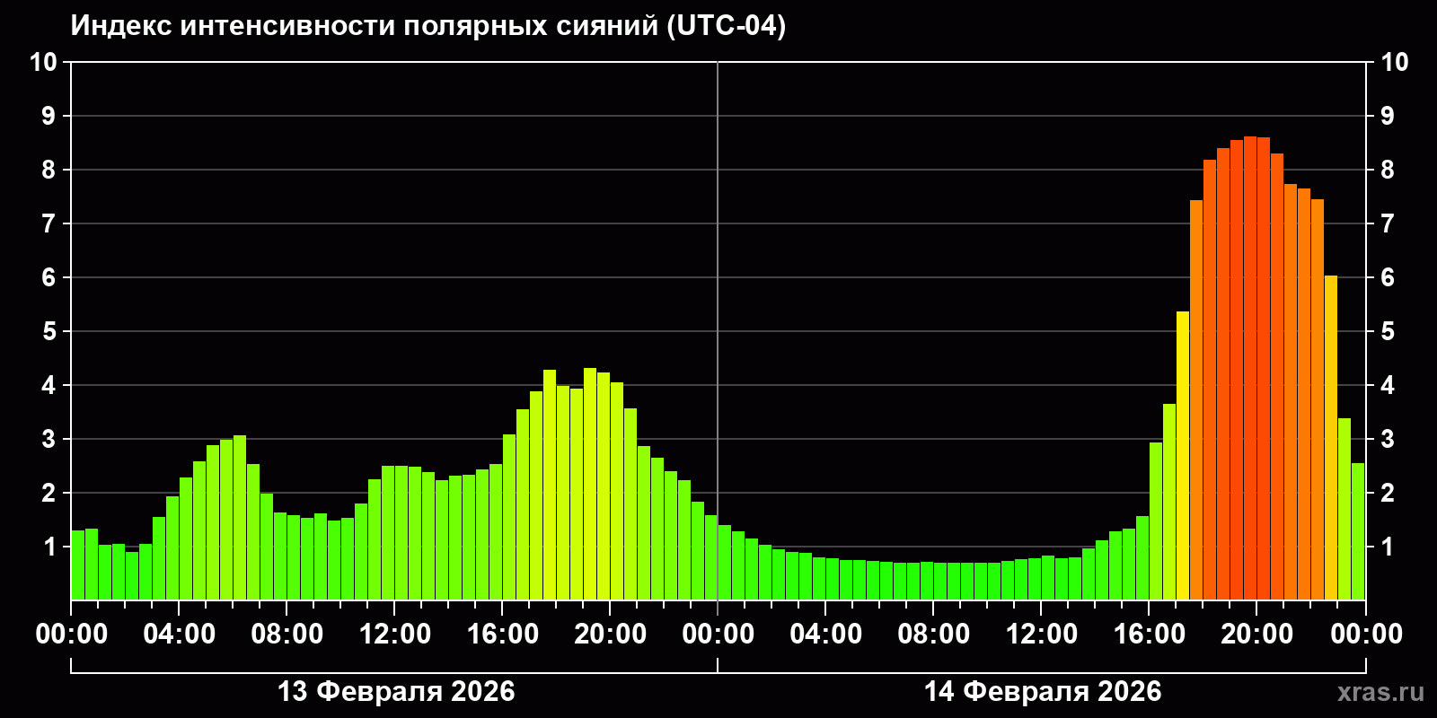 Изменения индекса интенсивности полярных сияний с 2026-02-13 по 2026-02-14 по местному времени
