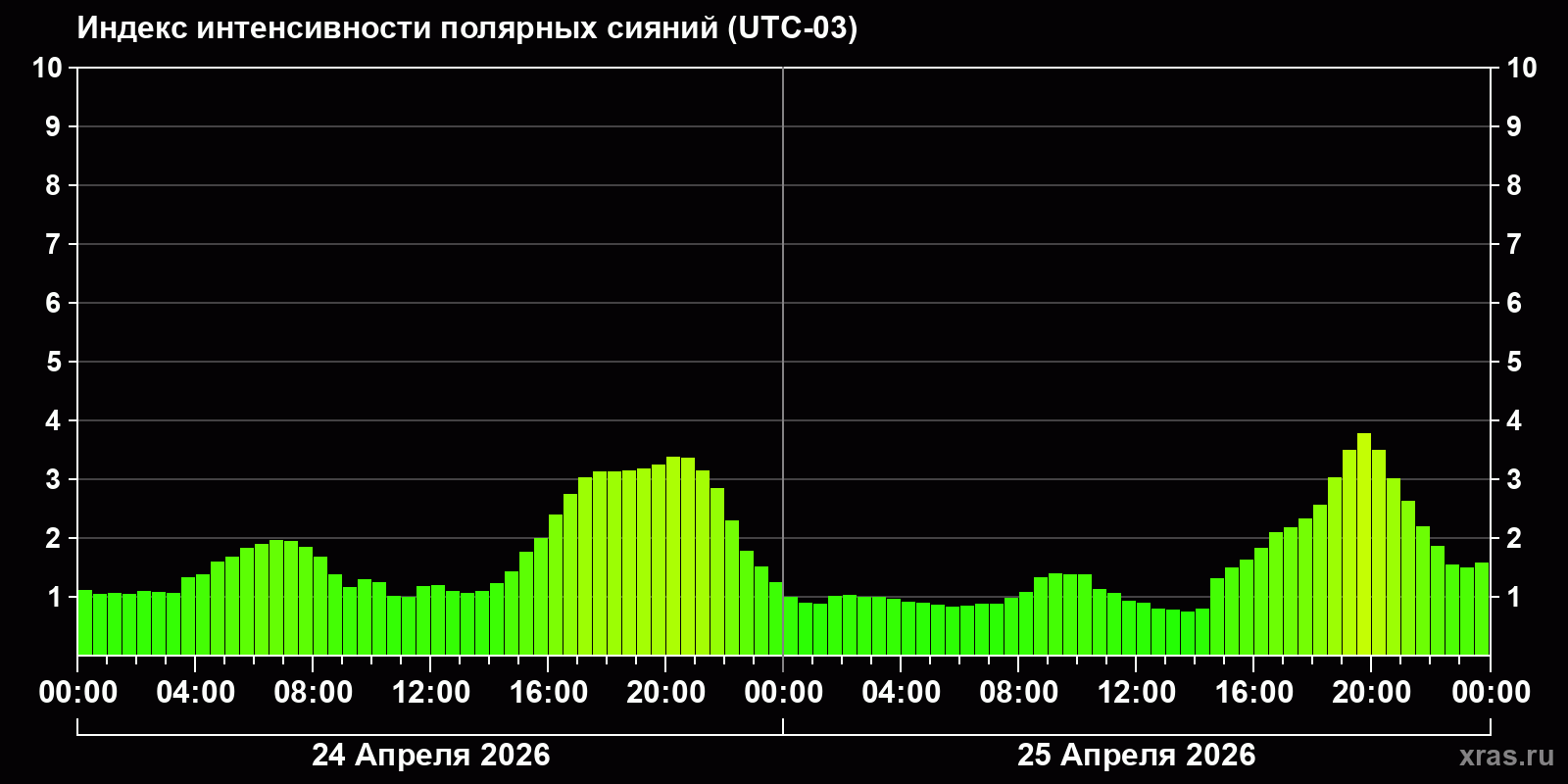 Изменения индекса интенсивности полярных сияний с 2026-04-24 по 2026-04-25 по местному времени