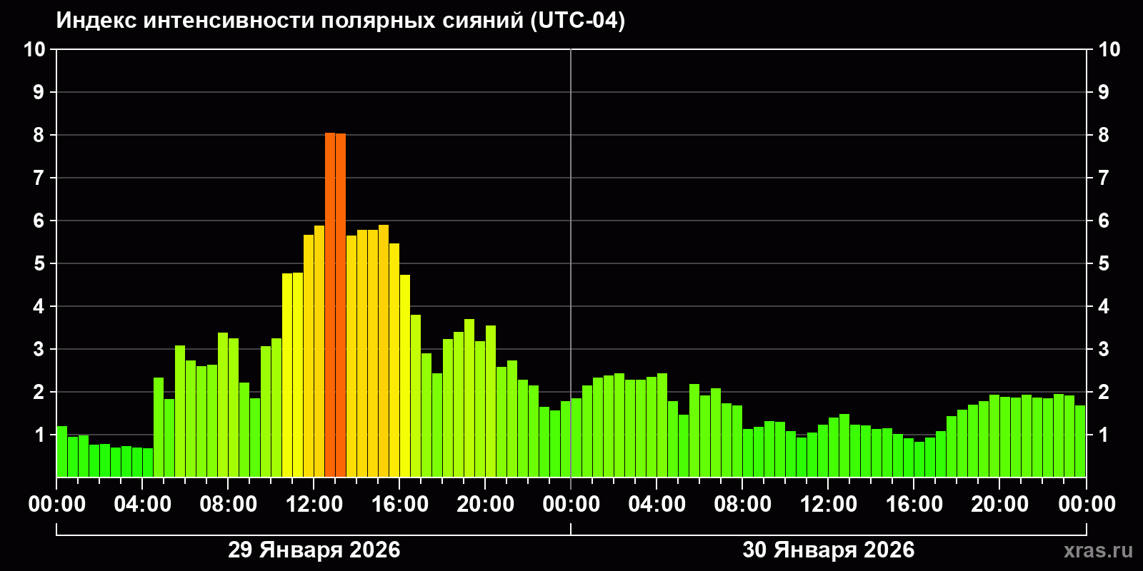 Изменения индекса интенсивности полярных сияний с 2026-01-29 по 2026-01-30 по местному времени
