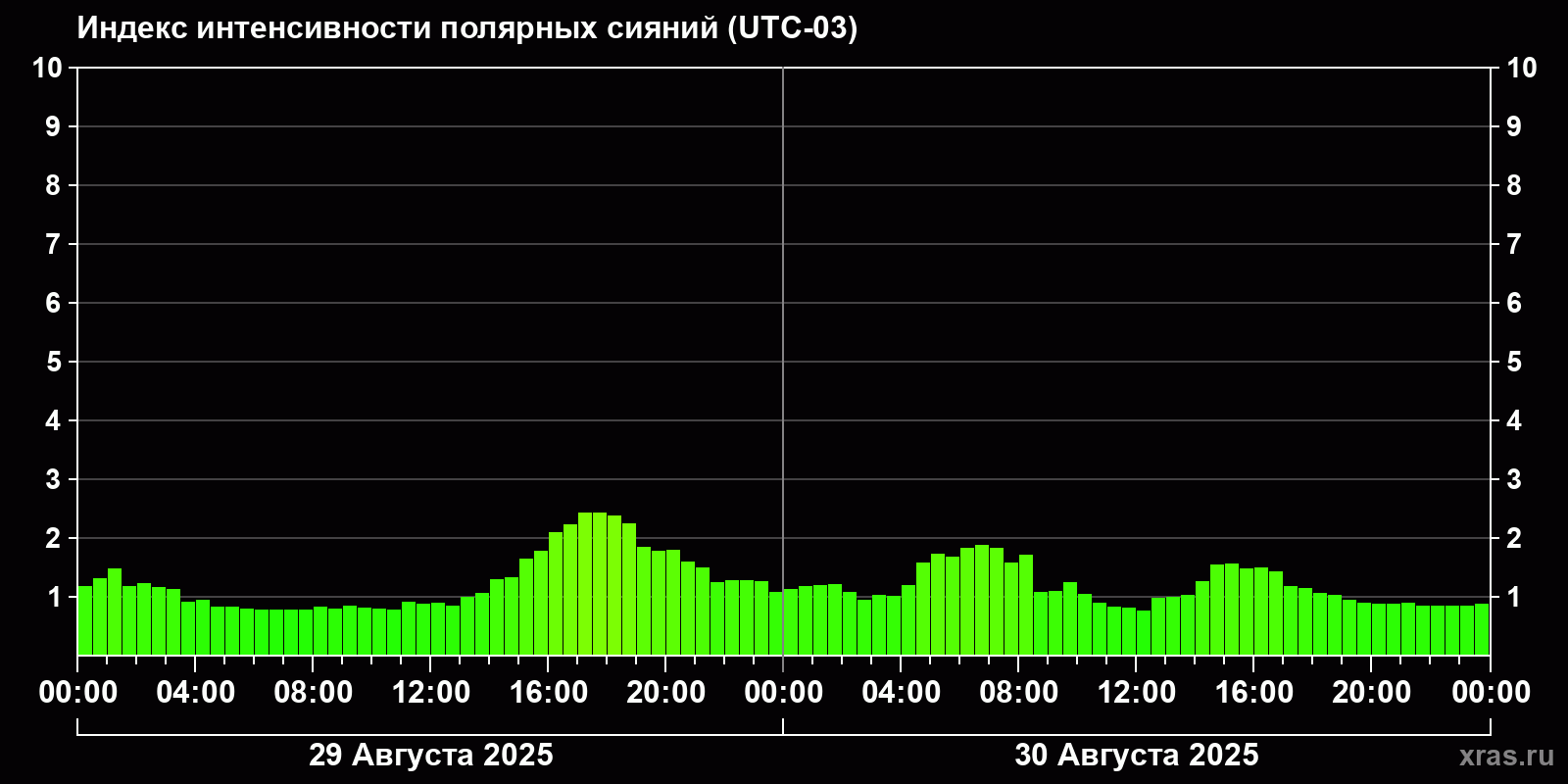 Изменения индекса интенсивности полярных сияний с 2025-08-29 по 2025-08-30 по местному времени