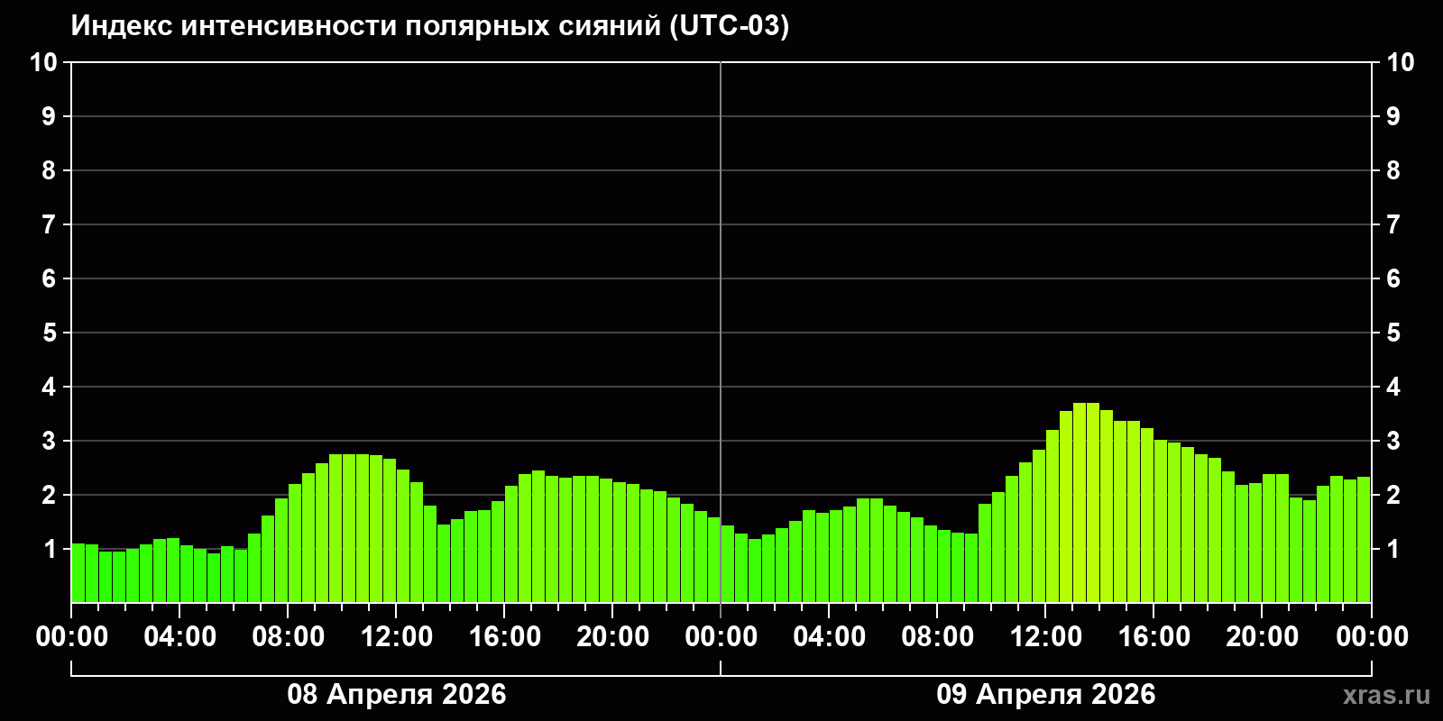 Изменения индекса интенсивности полярных сияний с 2026-04-08 по 2026-04-09 по местному времени